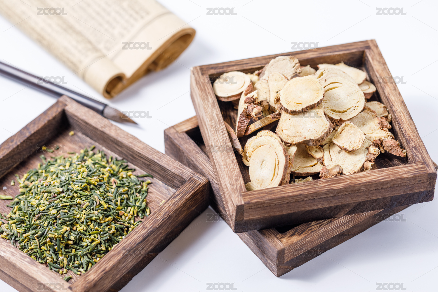 放在木盒里的中國藥材甘草片和蓮子心