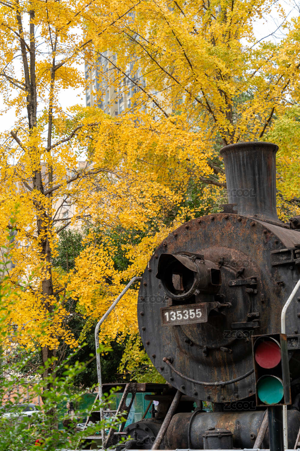 四川成都麻石煙云公園秋日銀杏與復(fù)古火車頭