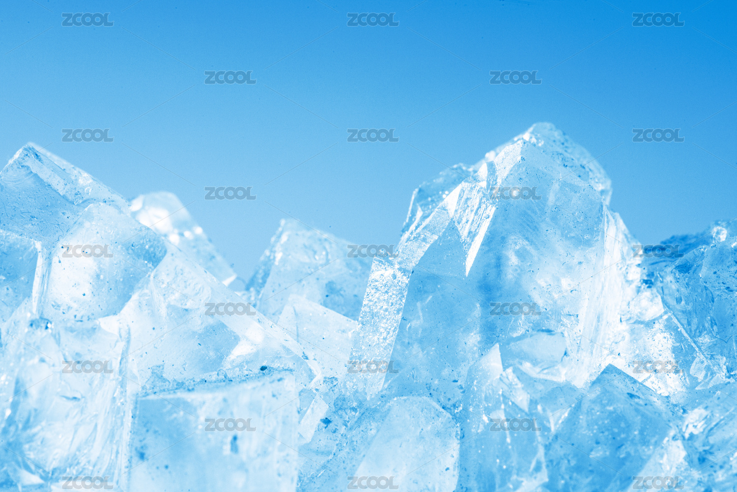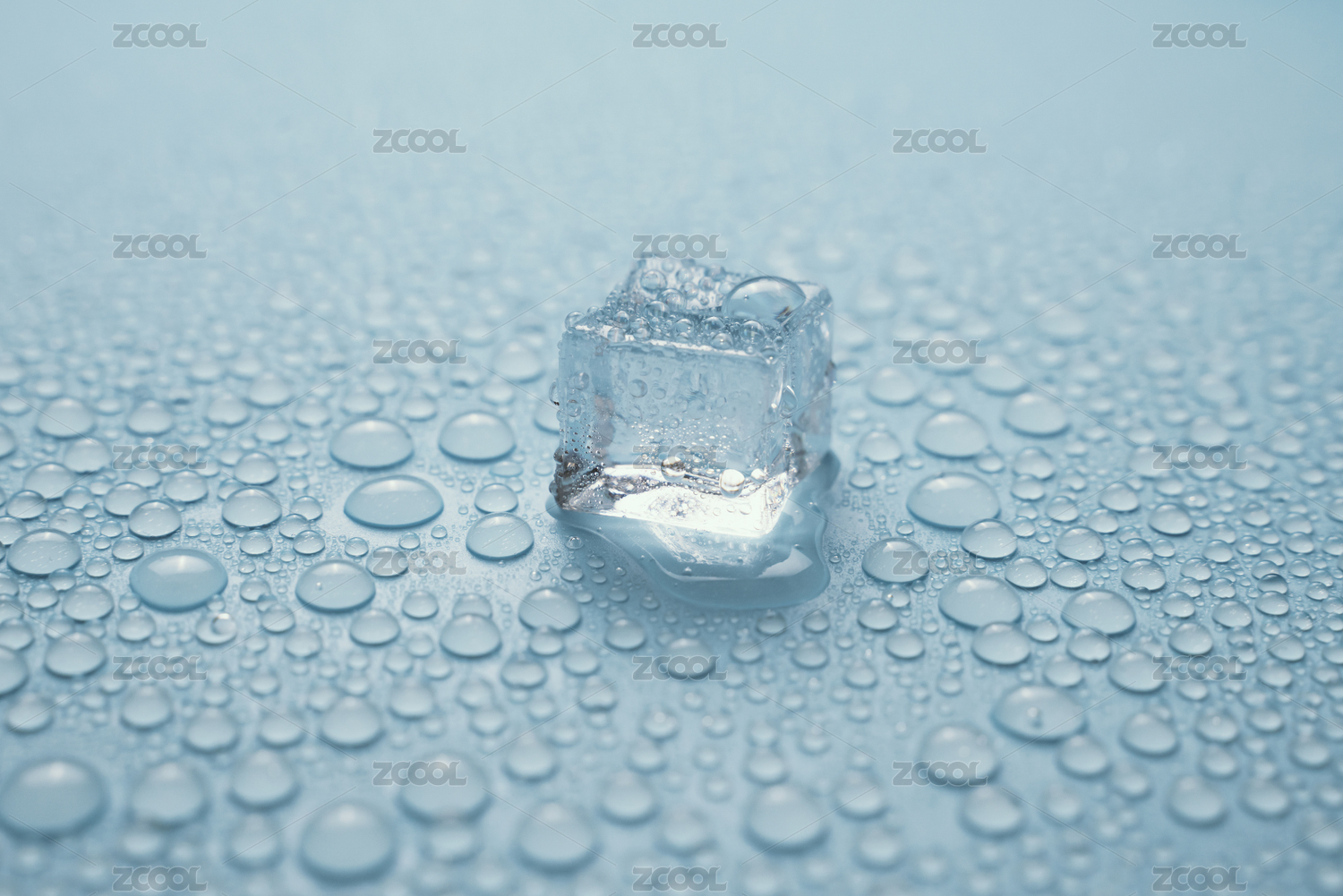 晶瑩剔透的水滴與將要融化的冰塊灑落在天藍(lán)色的背景上