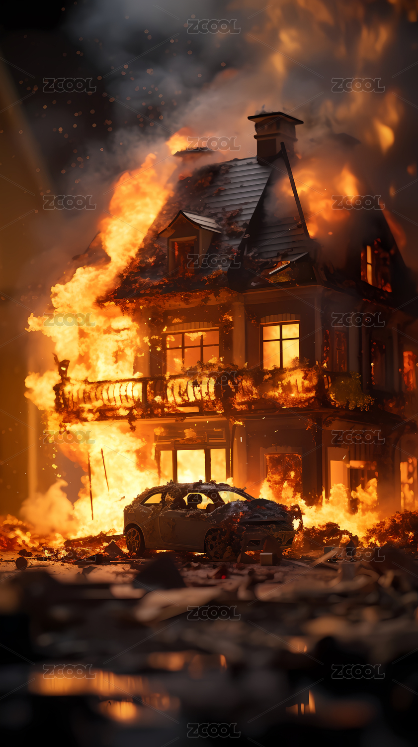 消防員在撲滅著火的房子微距攝影