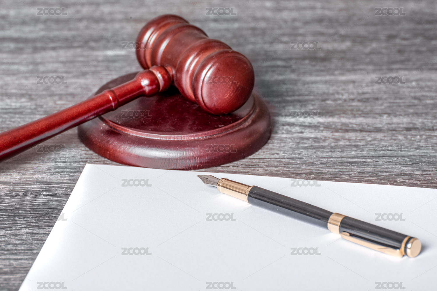法官錘與放在審判紙上的鋼筆