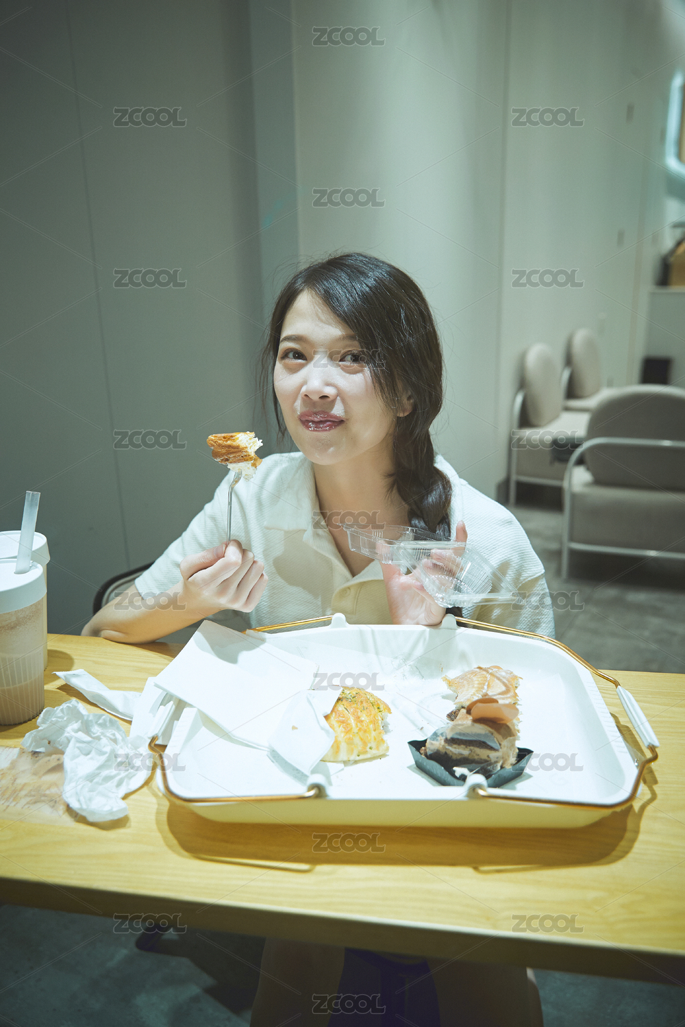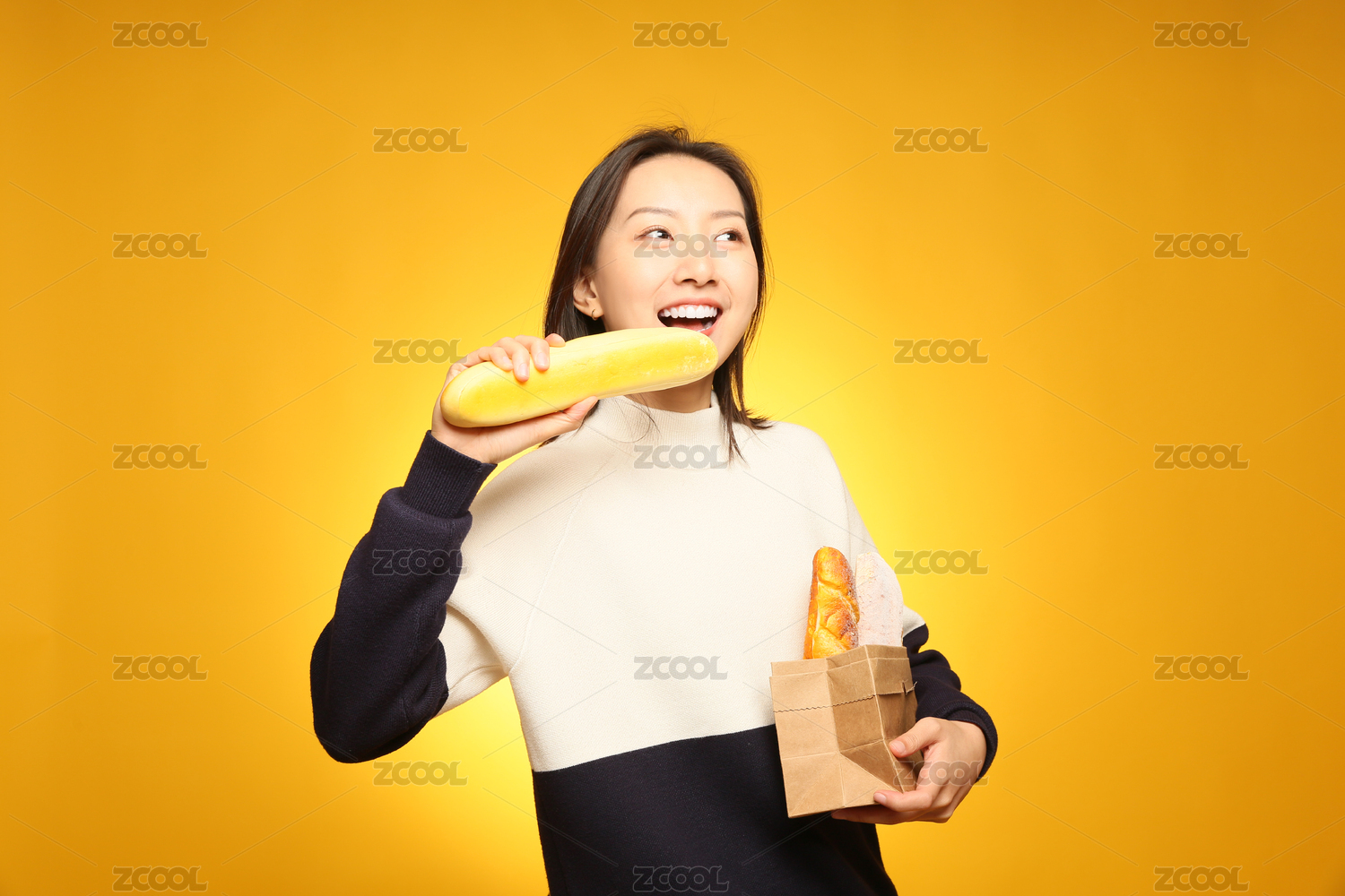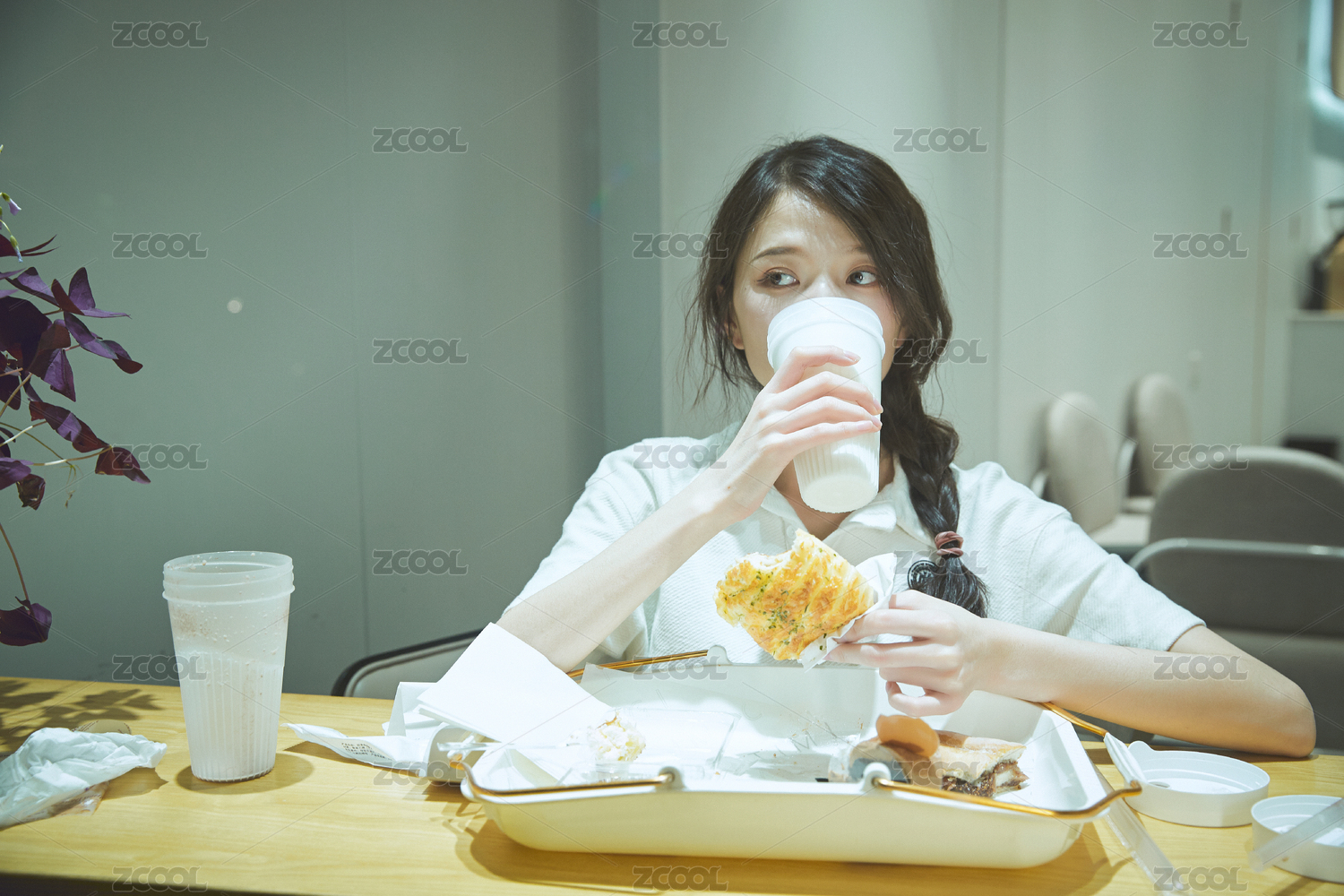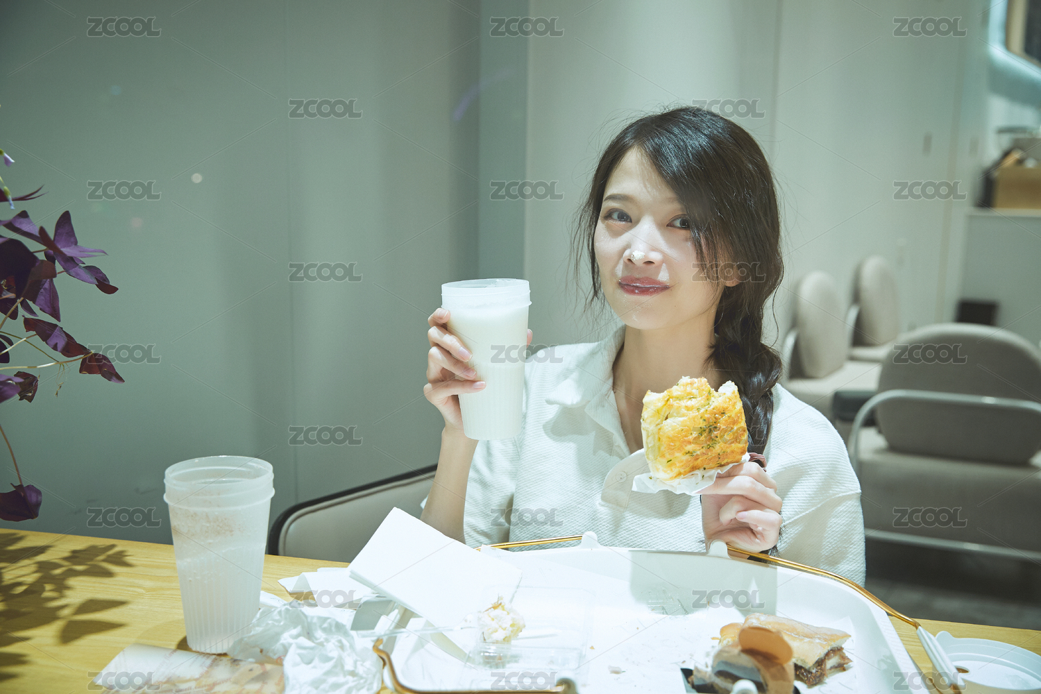 在烘焙店吃面包喝牛奶的可愛亞洲少女