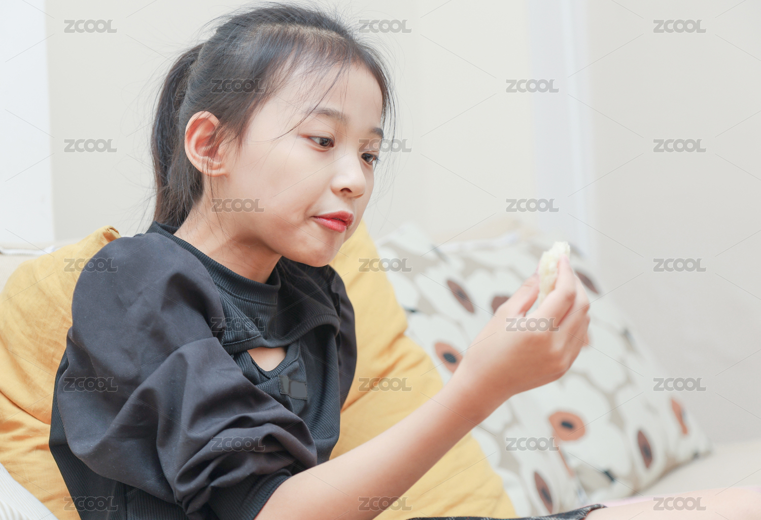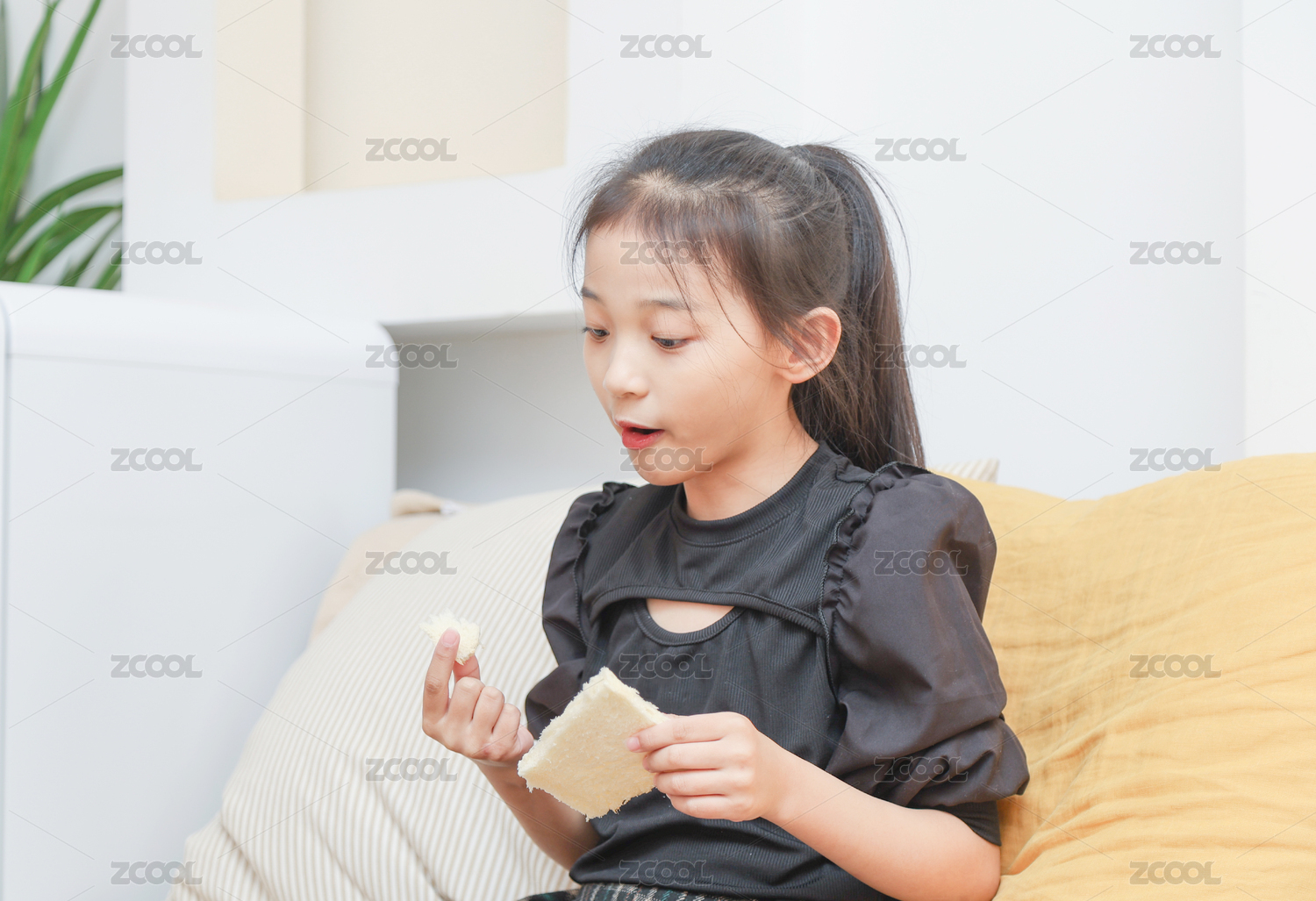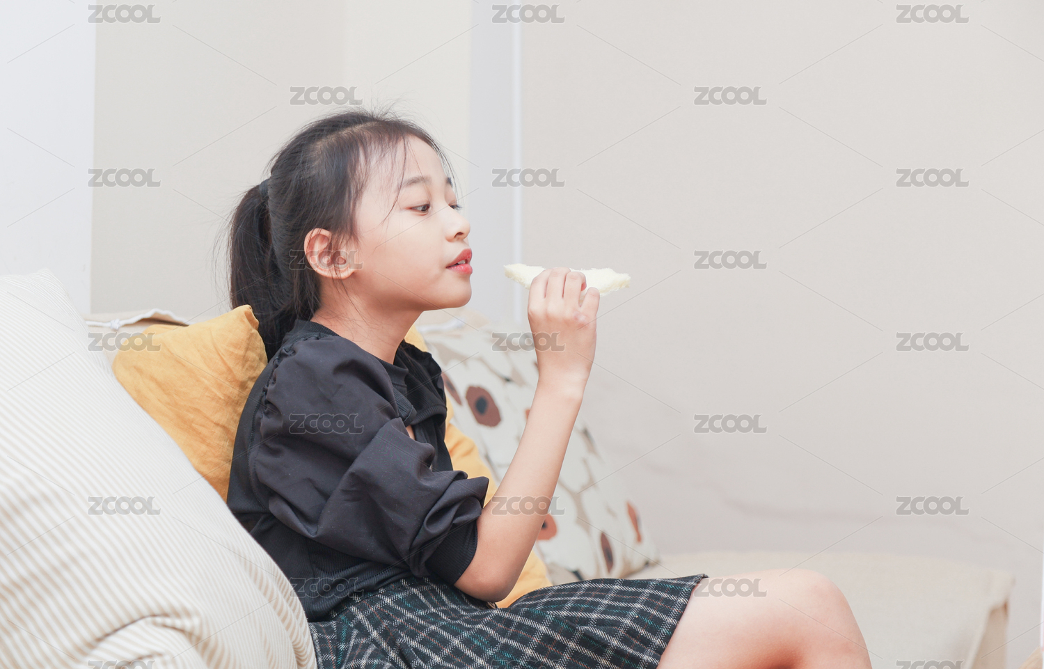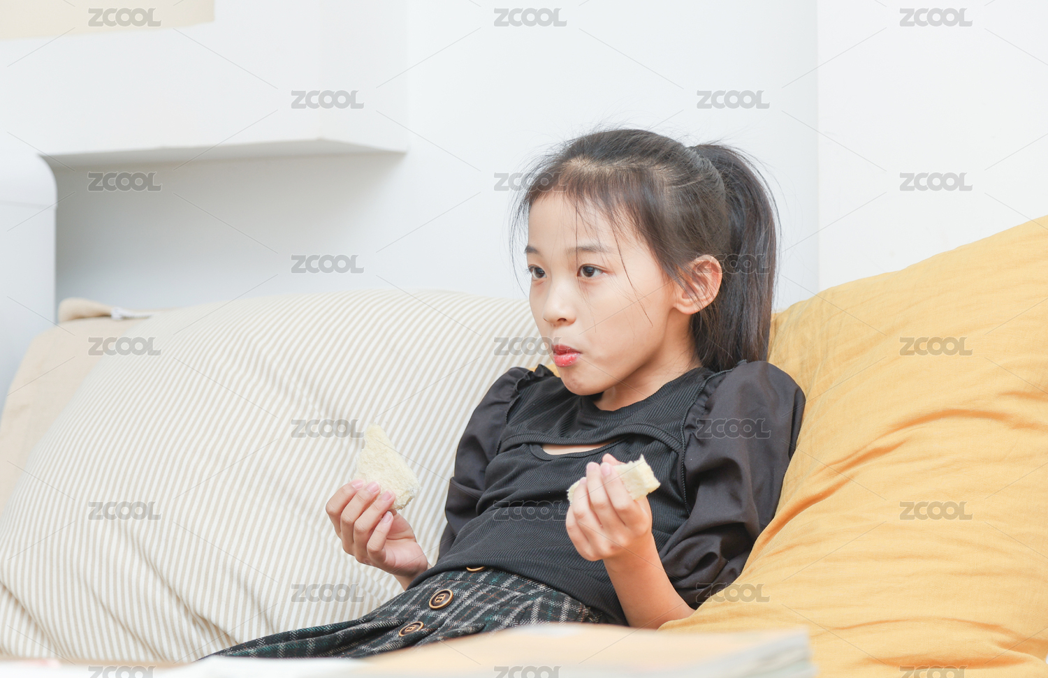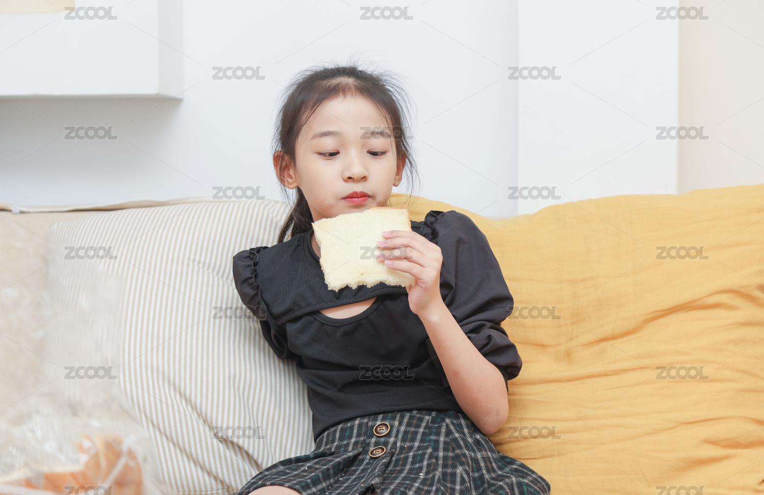 坐在沙發(fā)上吃面包片的小女孩抓拍