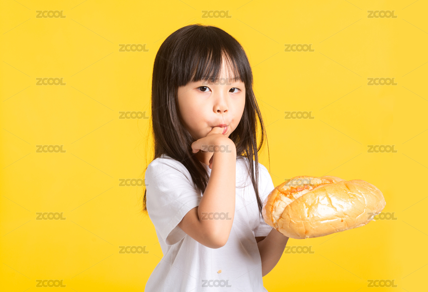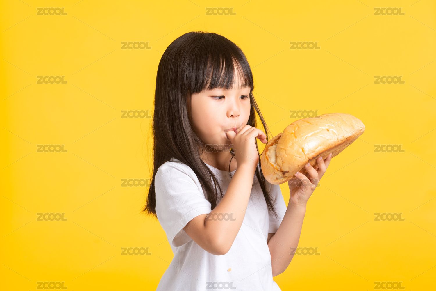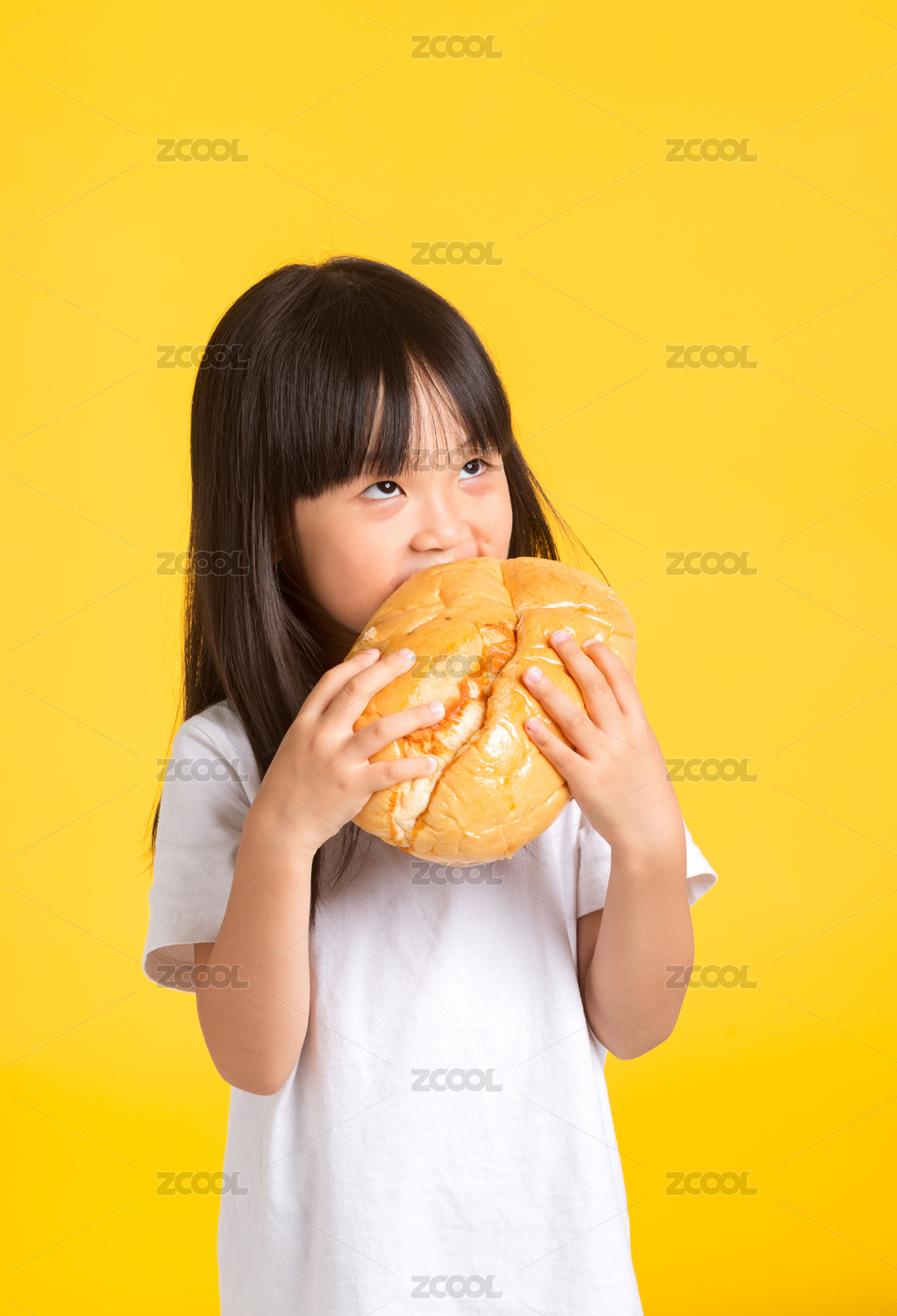 穿白色短袖吃面包的小女孩站在黃色背景前