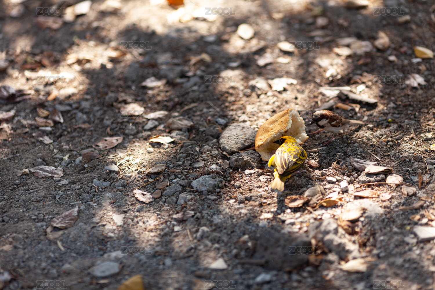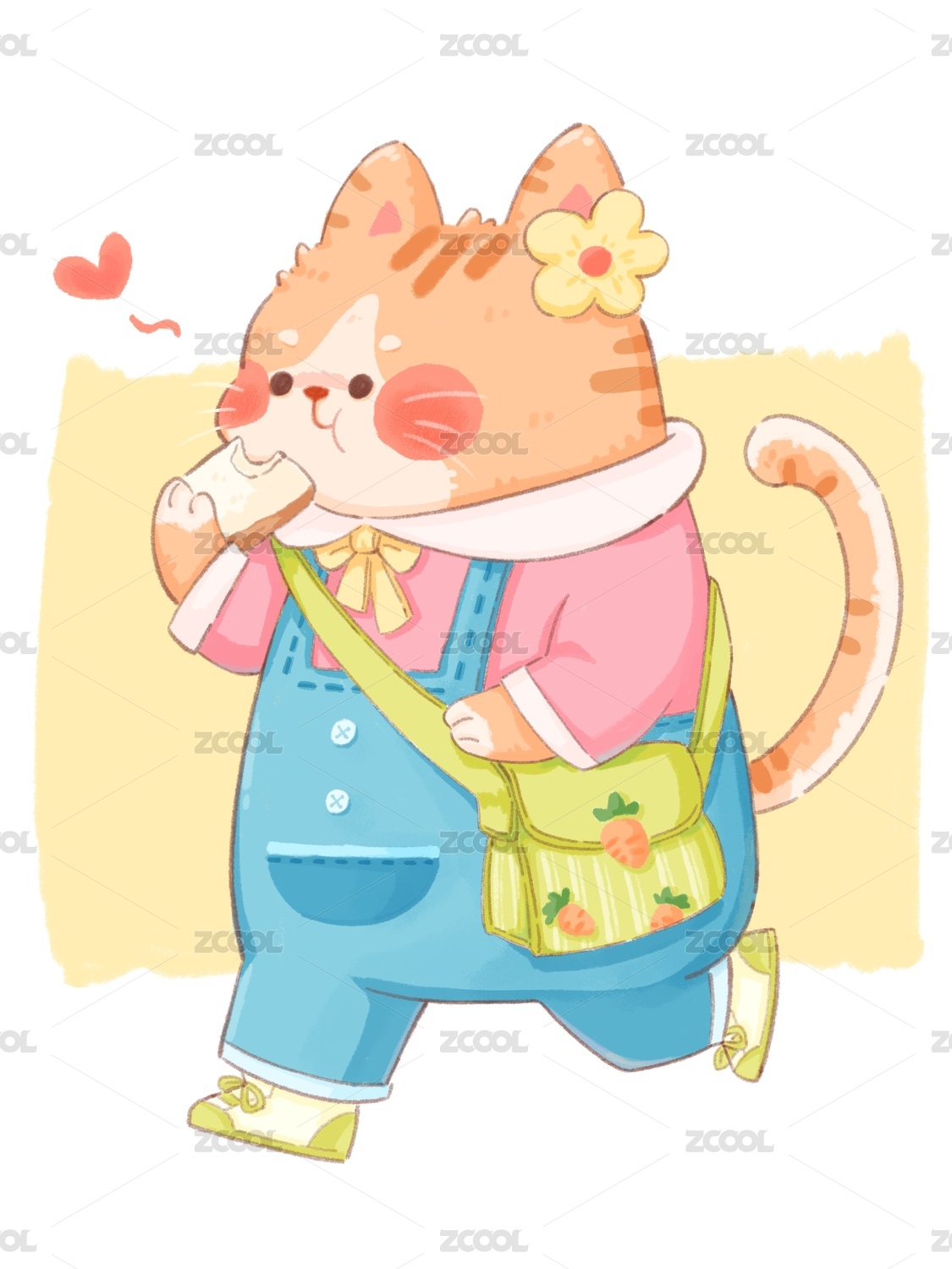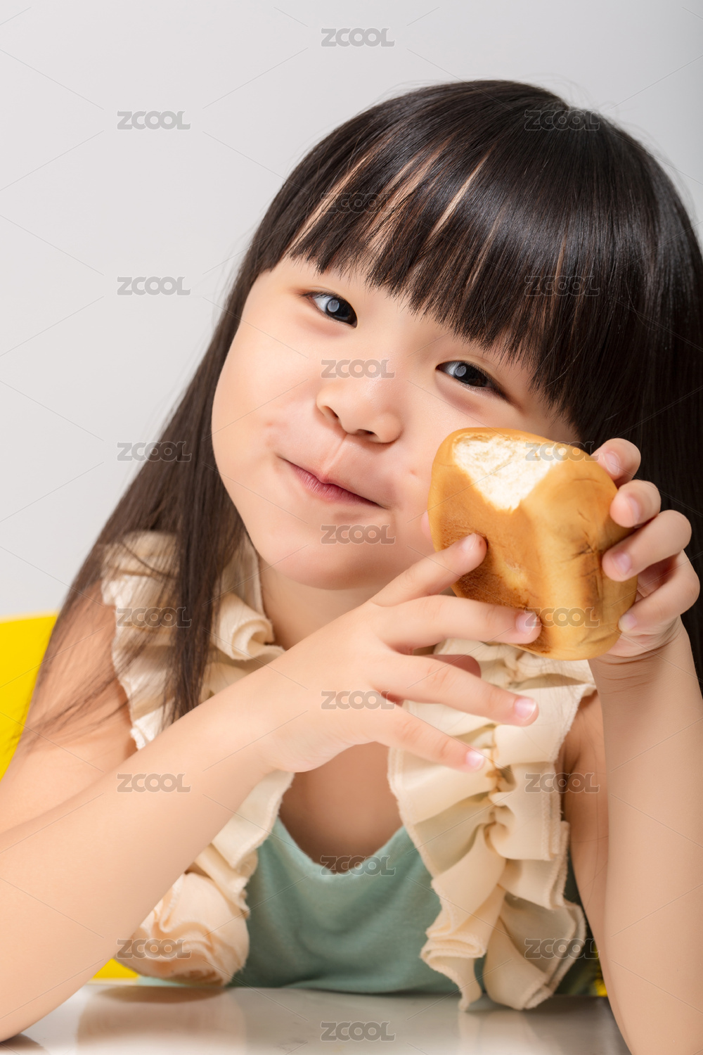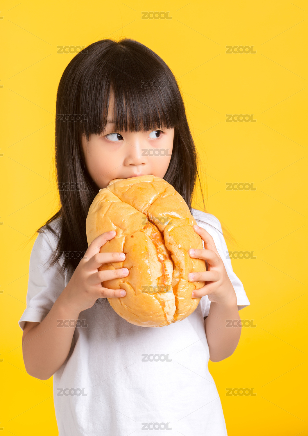 穿白色短袖吃面包的小女孩站在黃色背景前