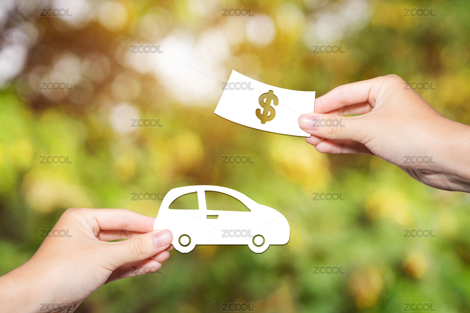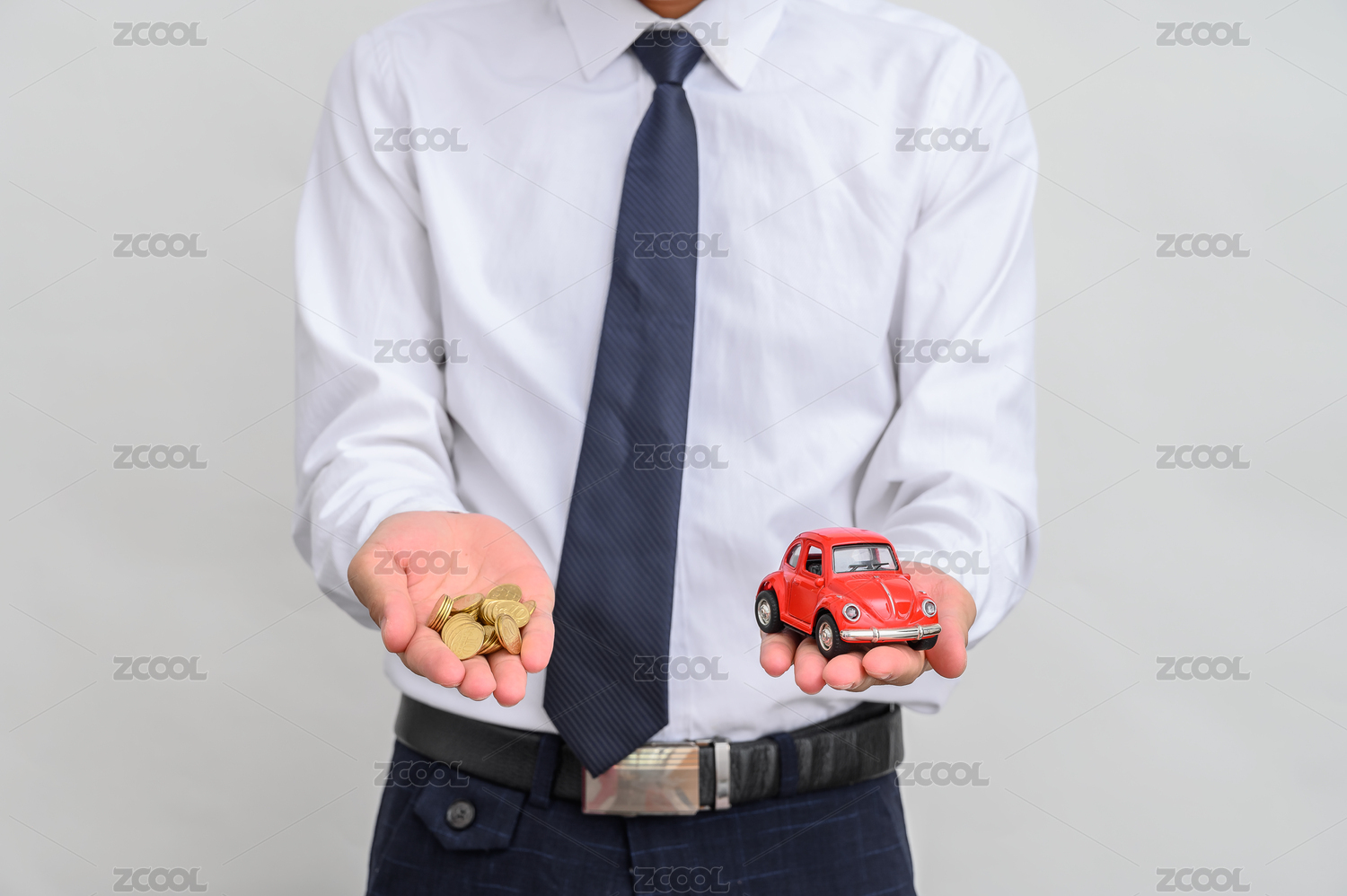 汽車銷售人員手拿文件硬板夾托著小汽車模型和車鑰匙及歐元硬幣