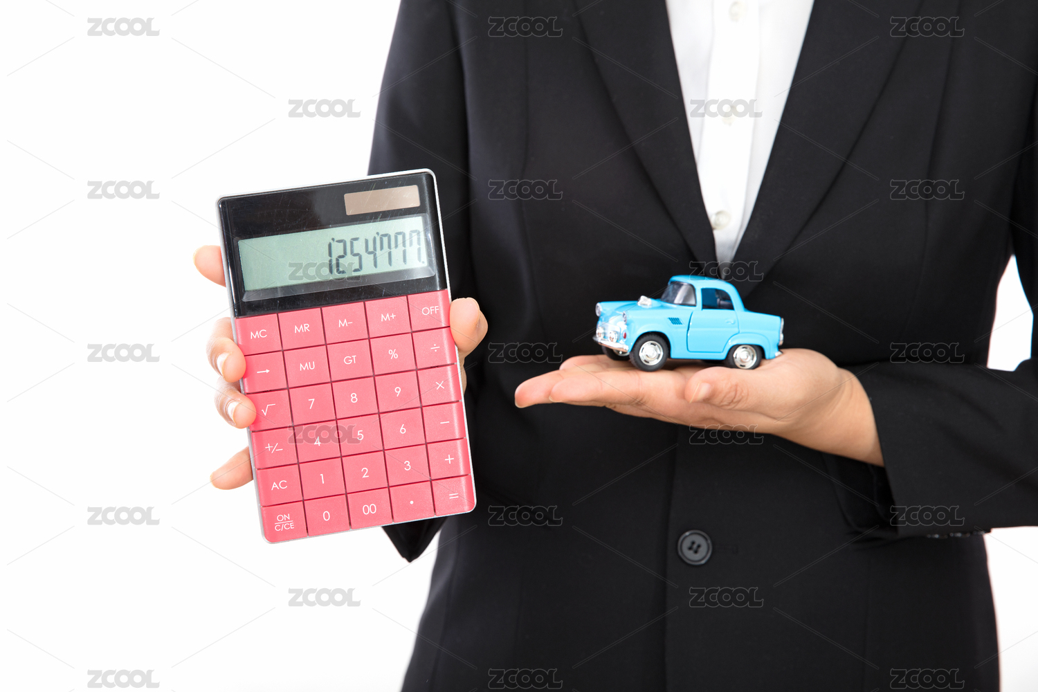 汽車銷售人員用計(jì)算器展示手里型號(hào)汽車的價(jià)格