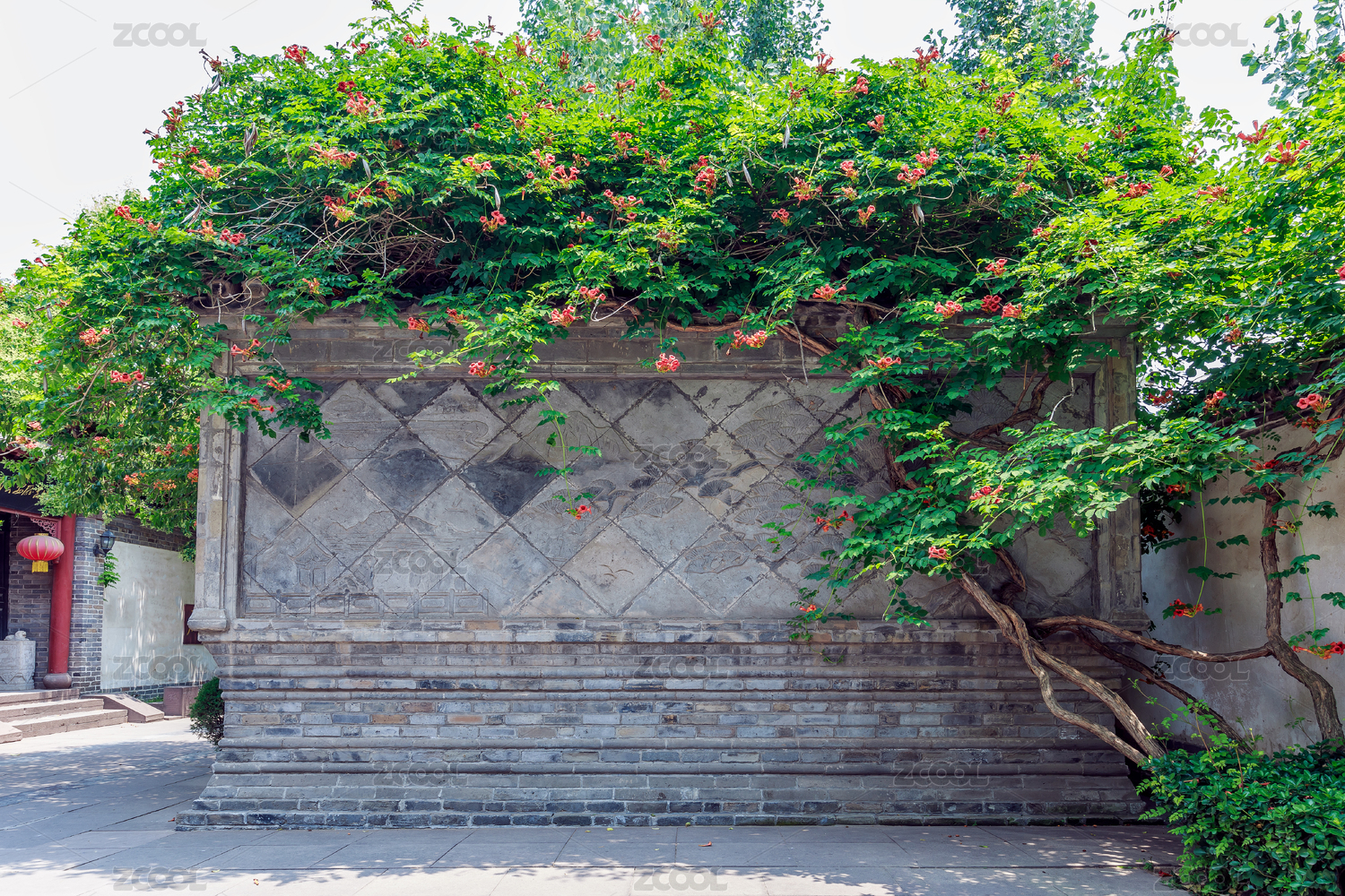 中國山東省莒南縣“山東省政府和八路軍115師司令部舊址”爬滿凌霄花藤的灰磚影壁墻