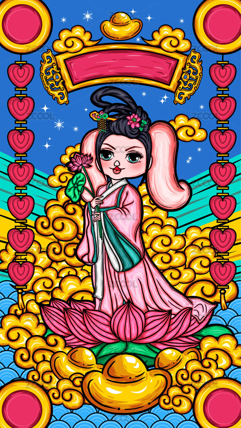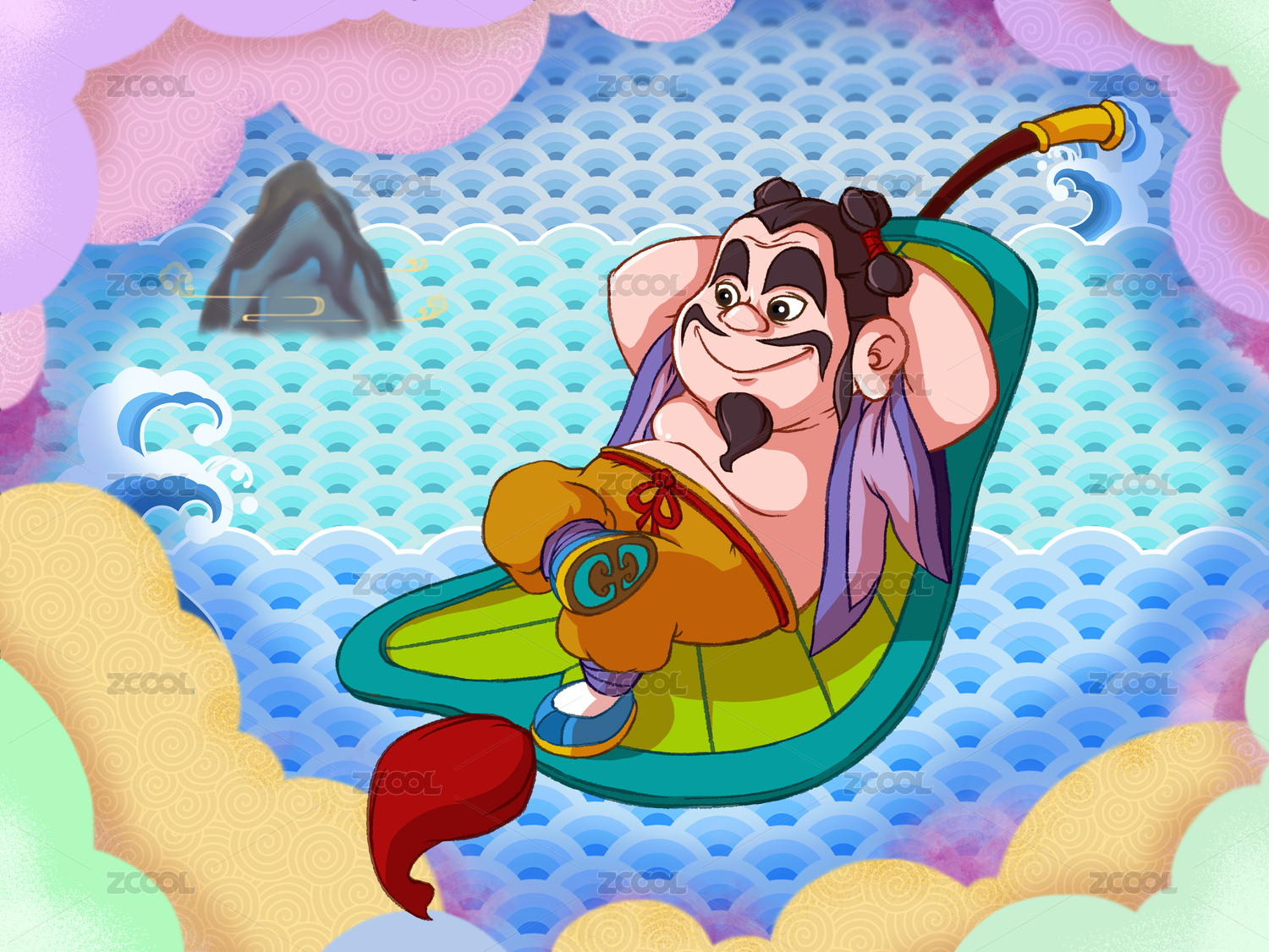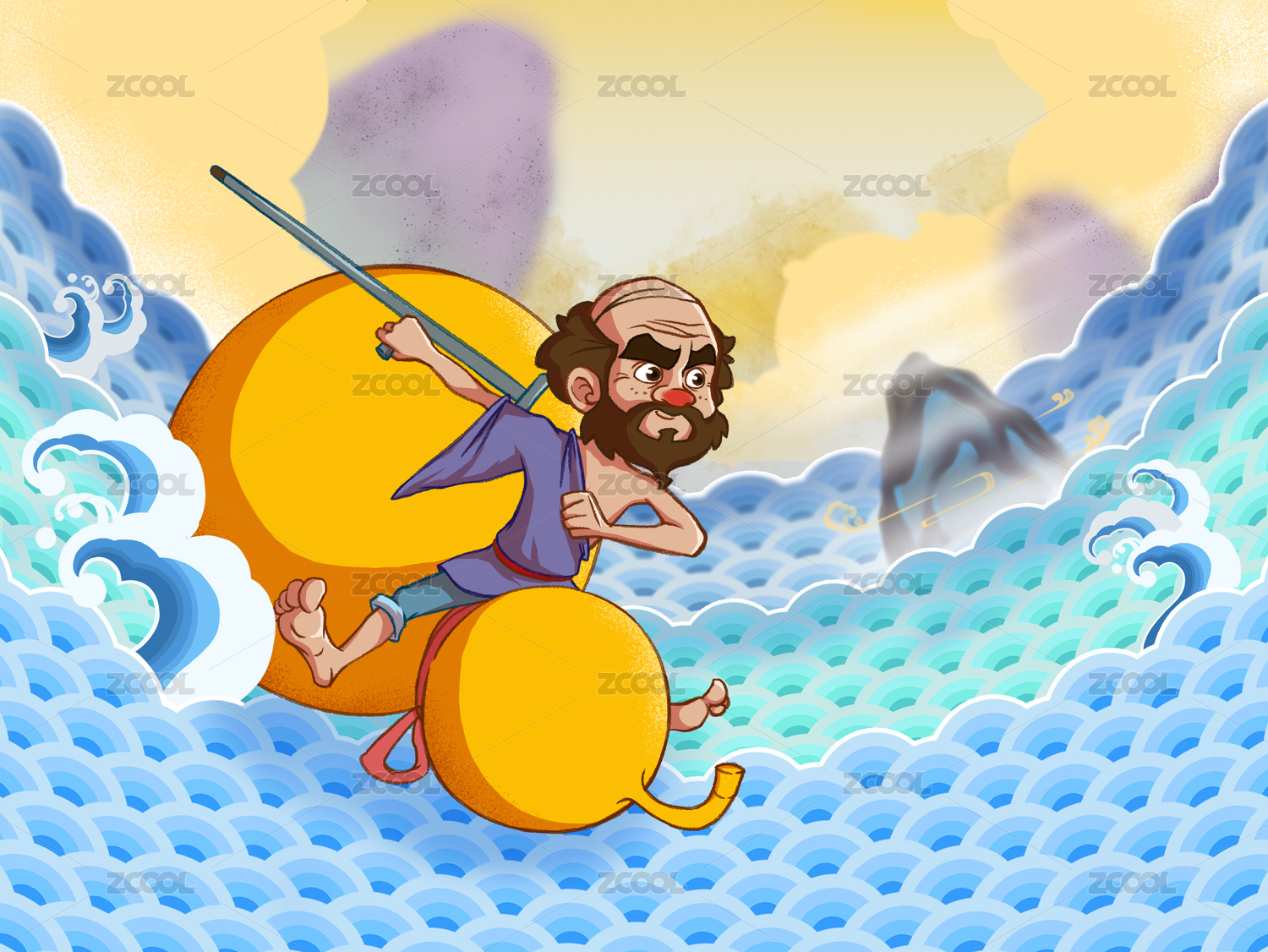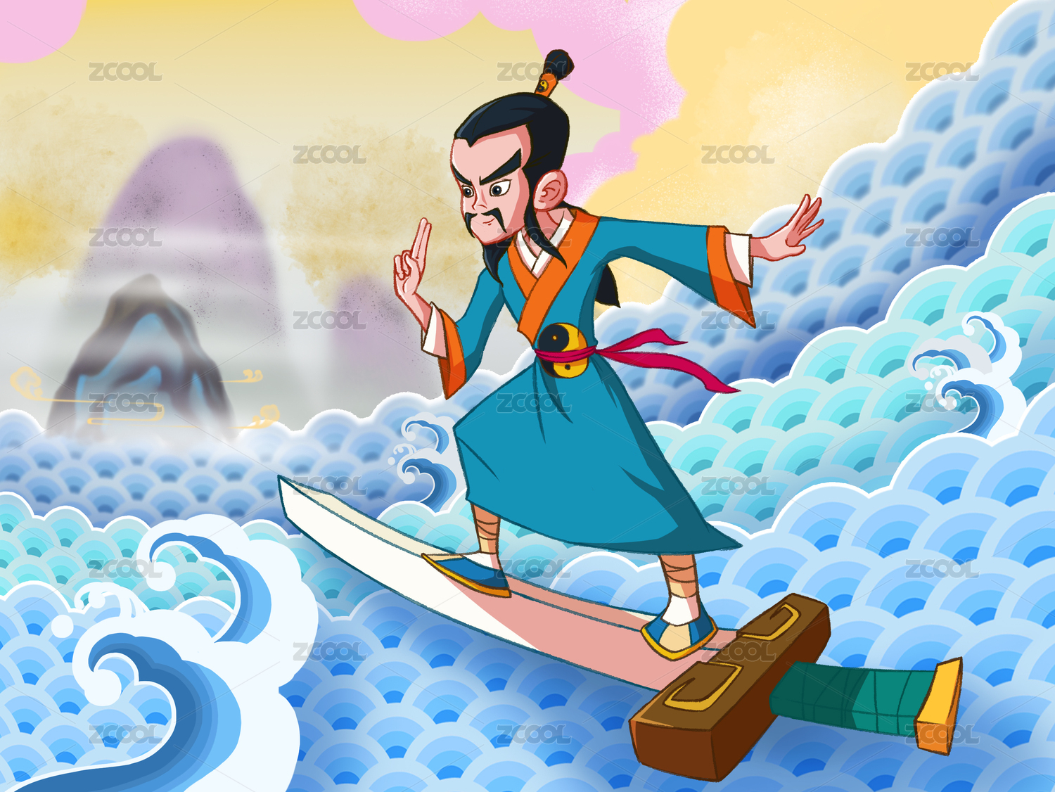 一張有樹、橋和太陽背景元素的八仙過海的裝