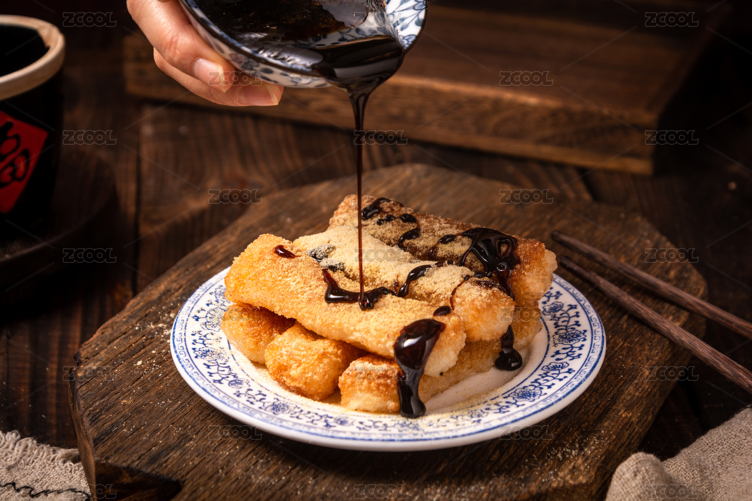 復(fù)古中式木紋桌子上的美味菜品紅糖糍粑