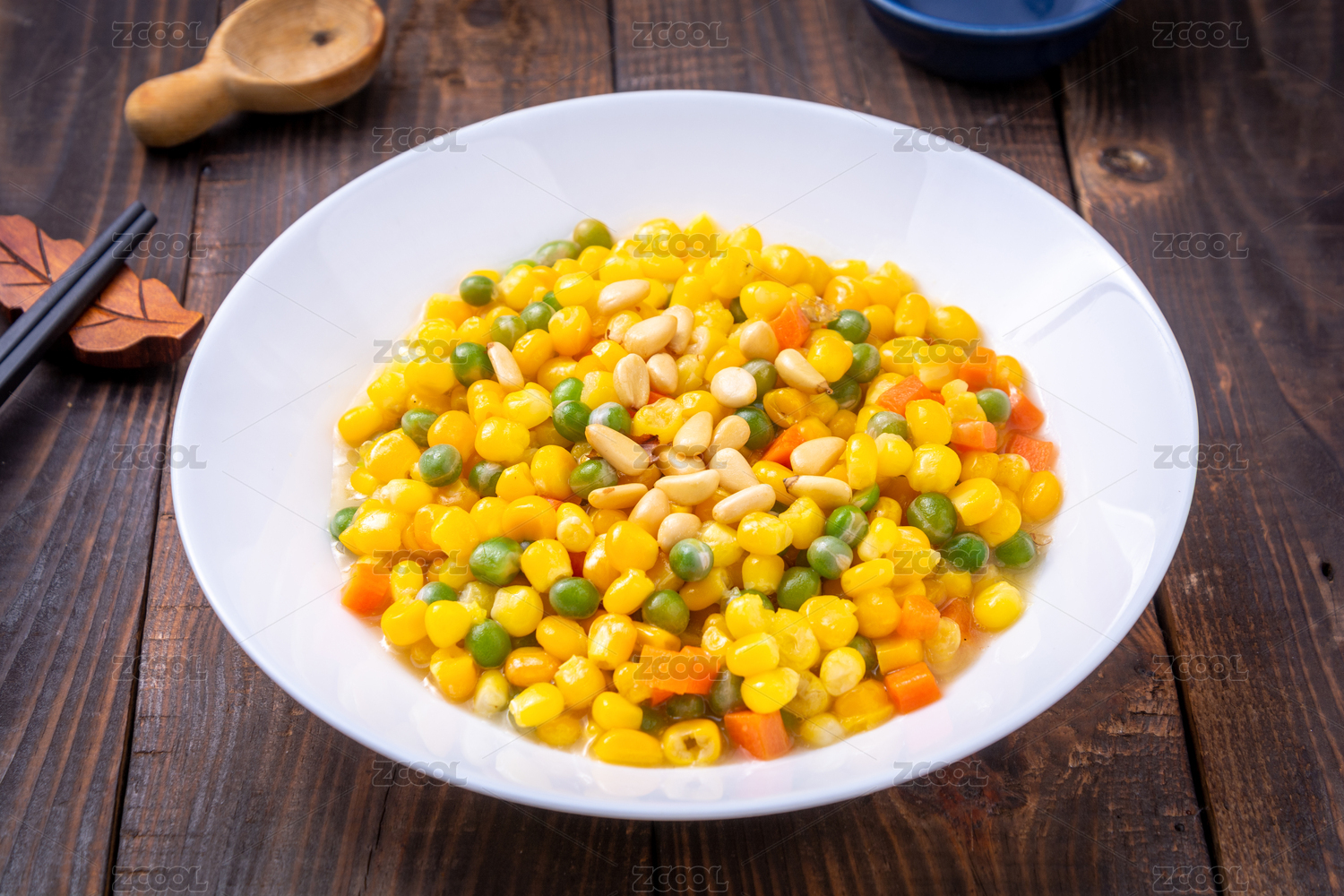 復(fù)古中式木桌上的一盤松仁玉米