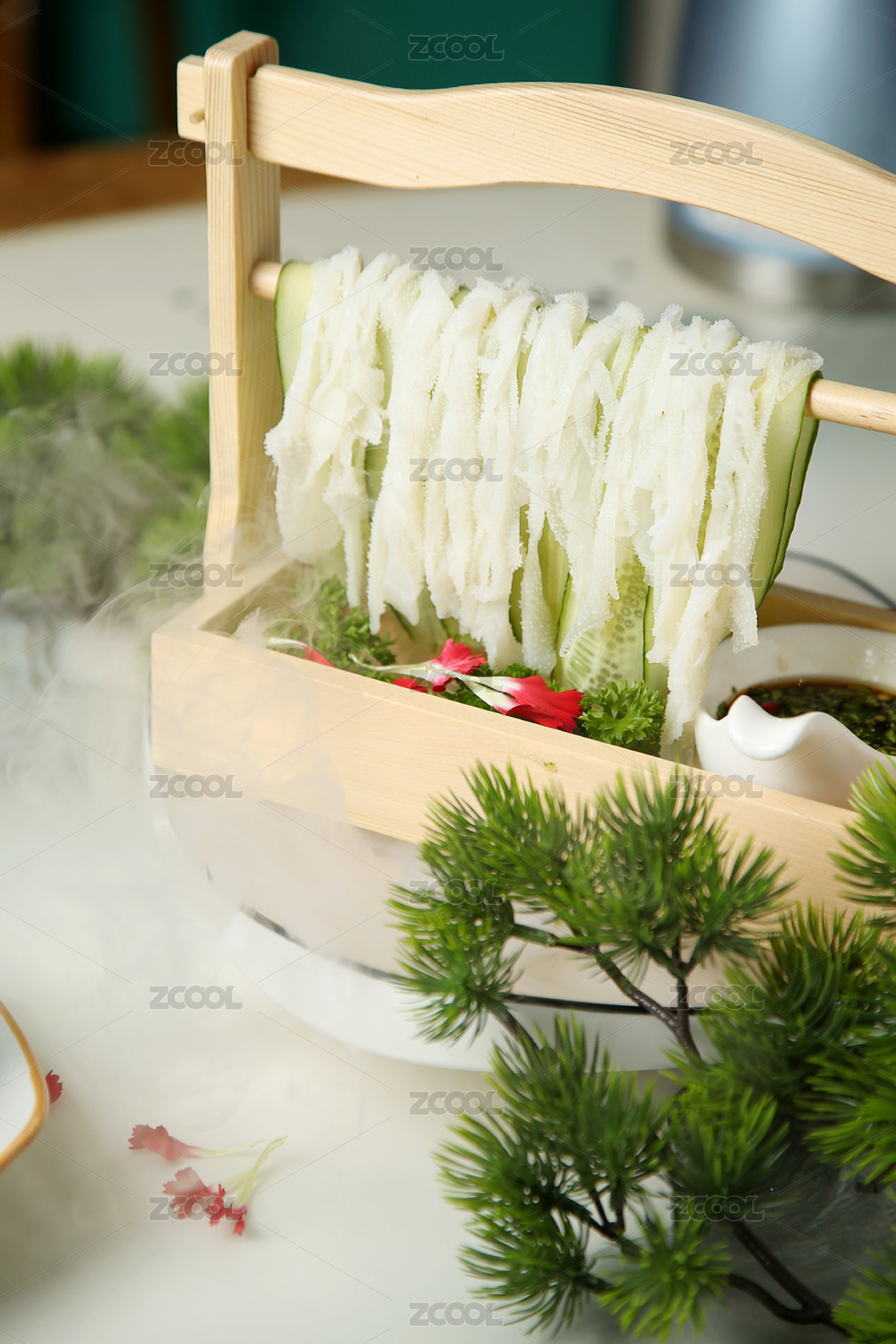 木桌上的一盤菠菜拌粉絲