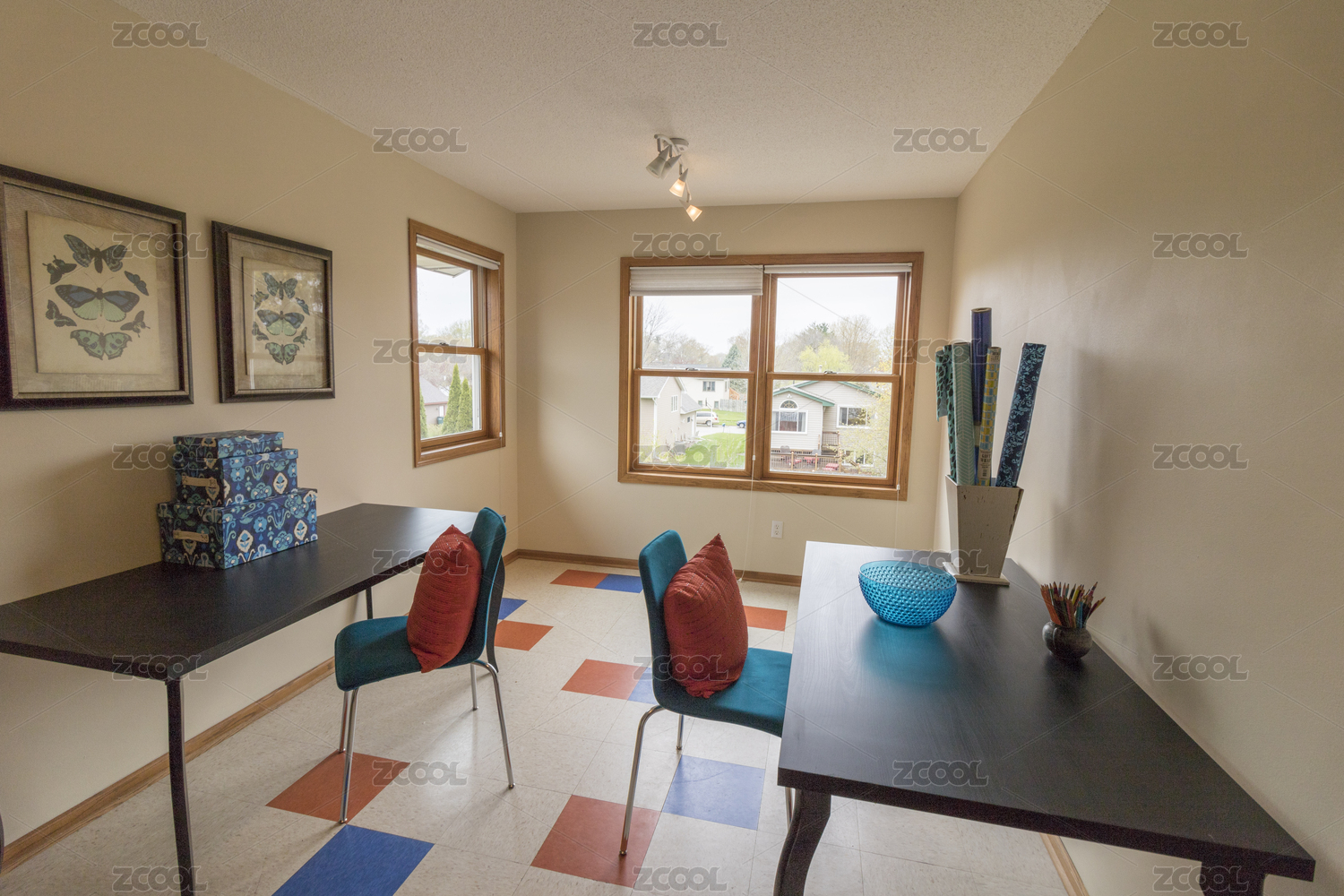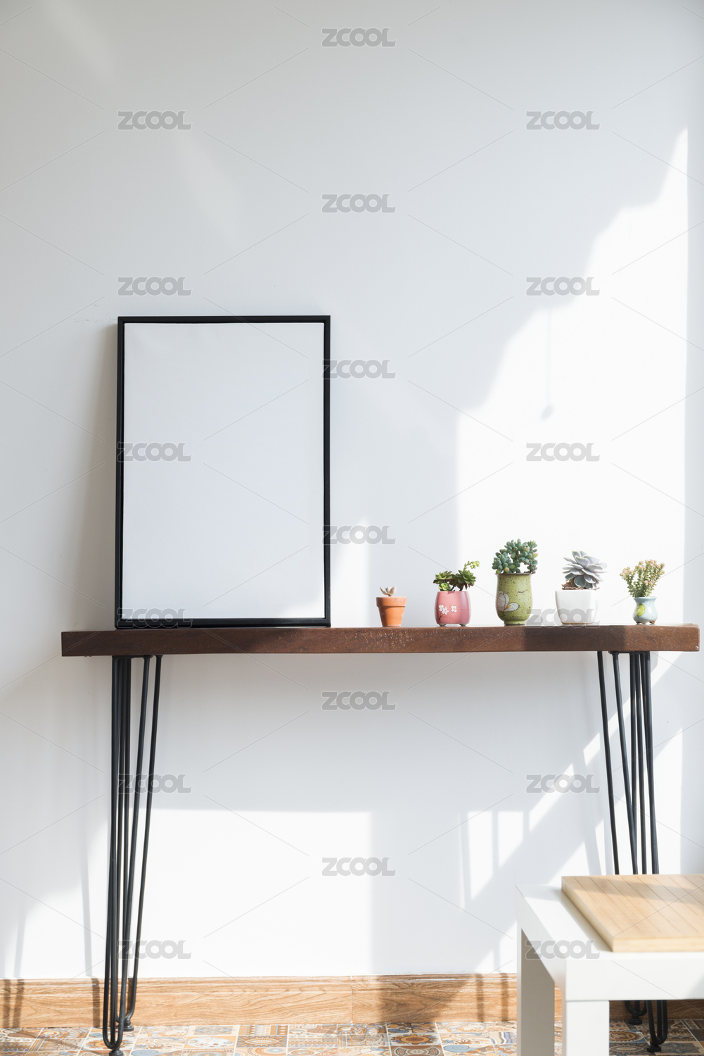 一間廣場明亮的起居室,桌子上擺著裝飾畫