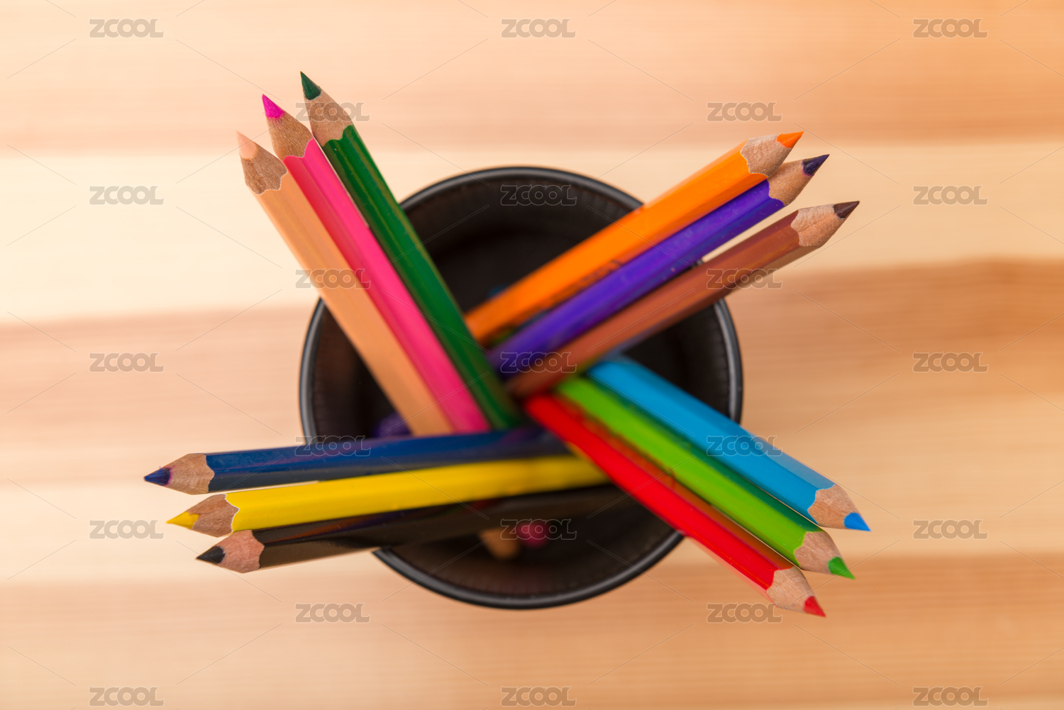 松木紋桌面上黑筆筒里的十二色彩色鉛筆