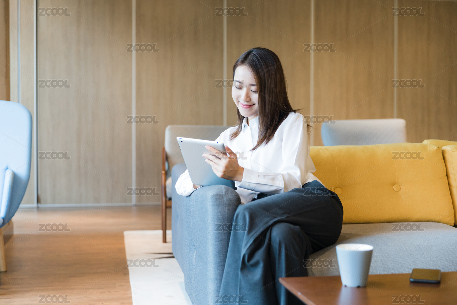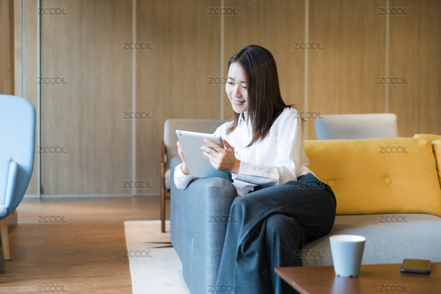 一名職業(yè)人士在沙發(fā)上使用平板電腦
