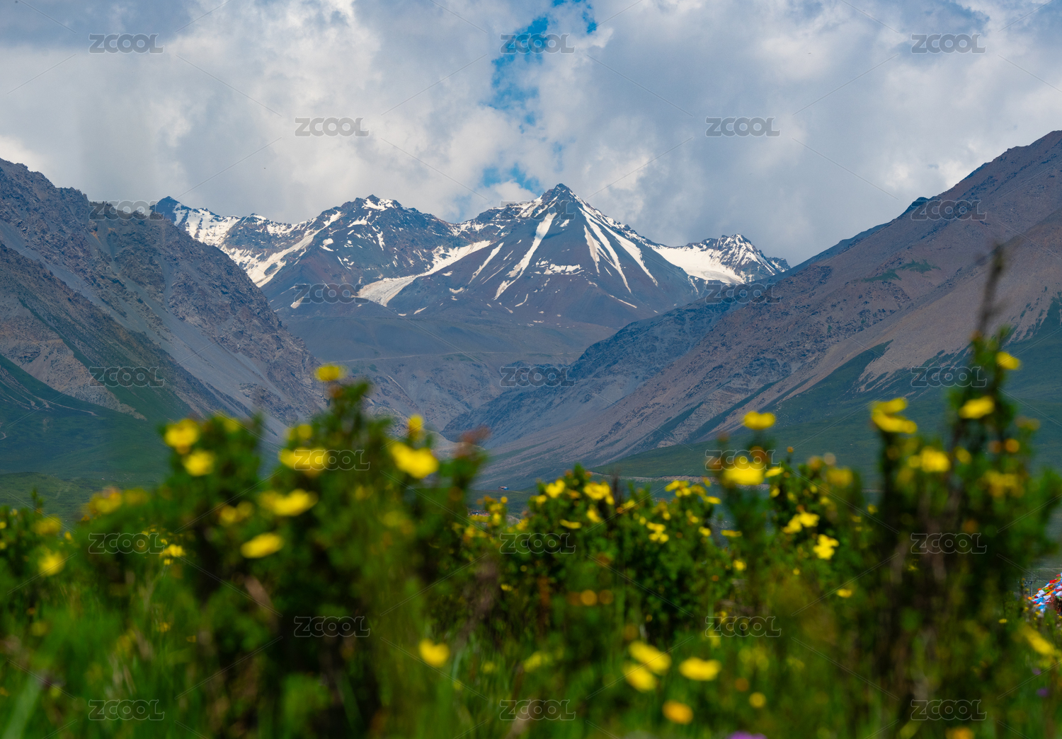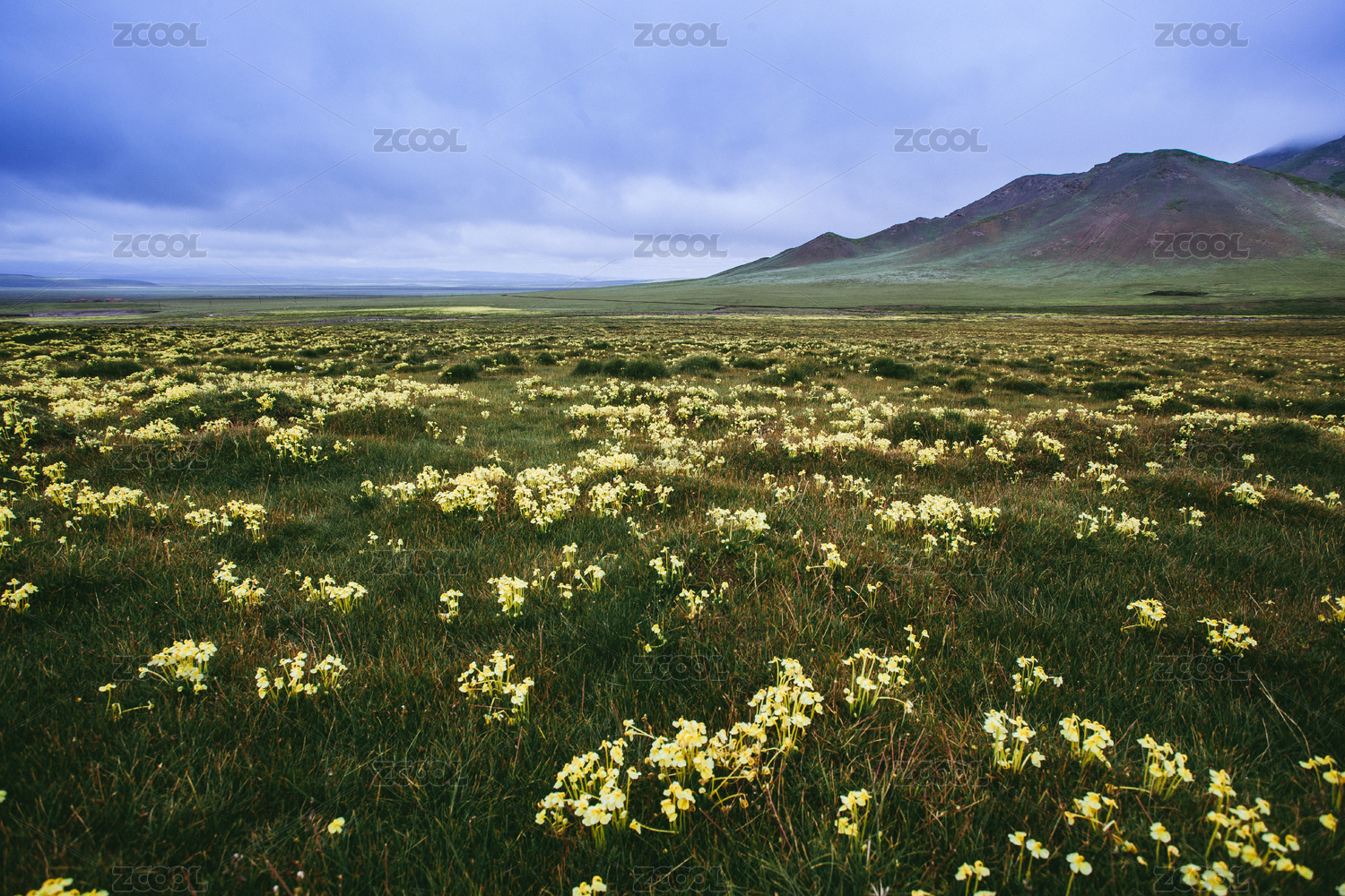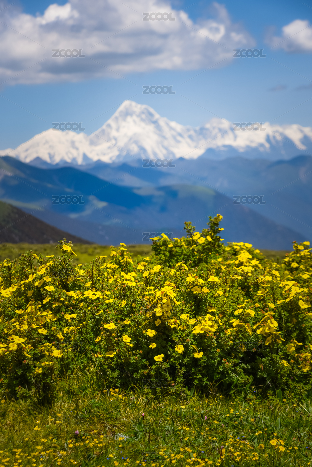 中國(guó)新疆雪山下草原上盛開的小黃花