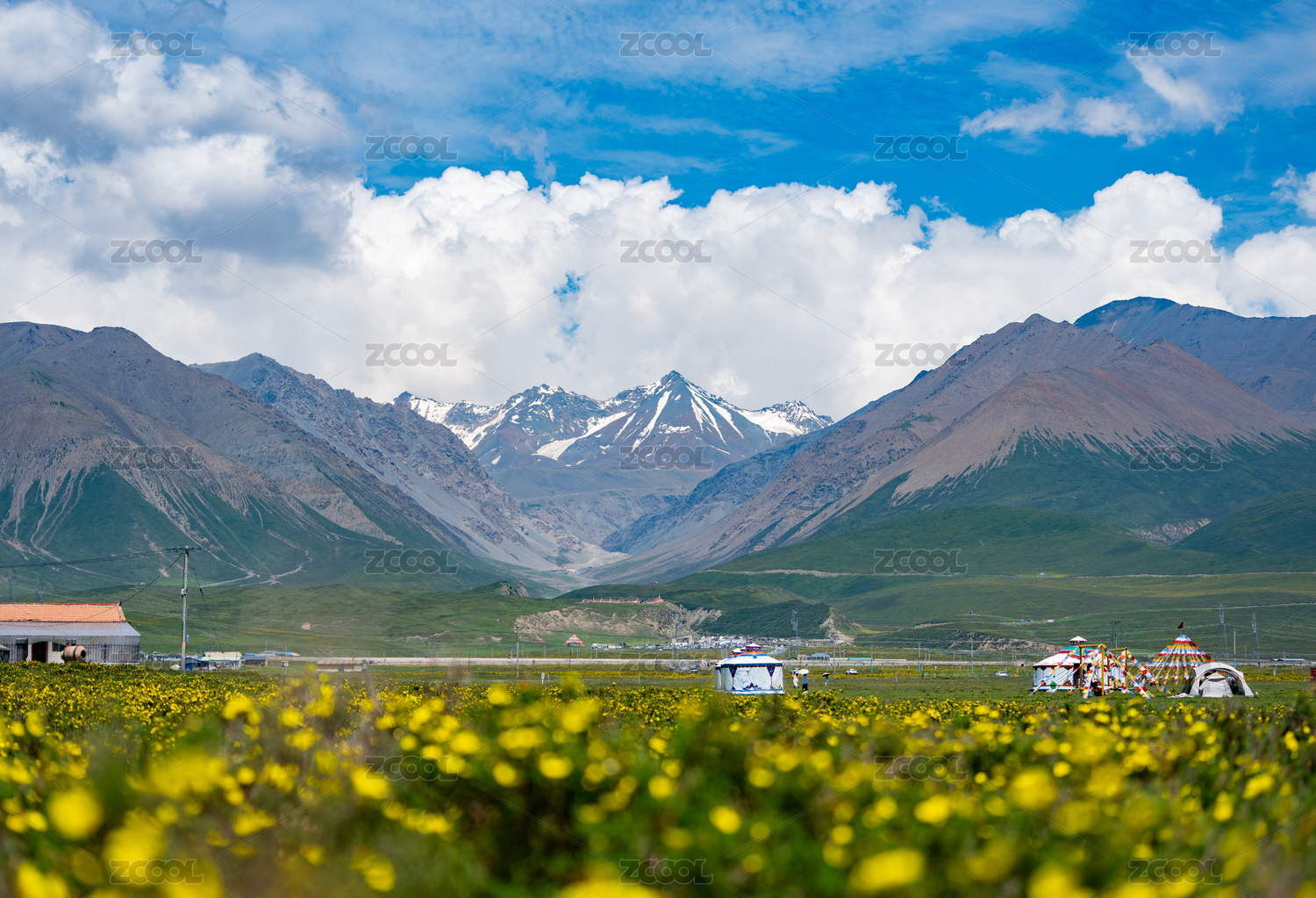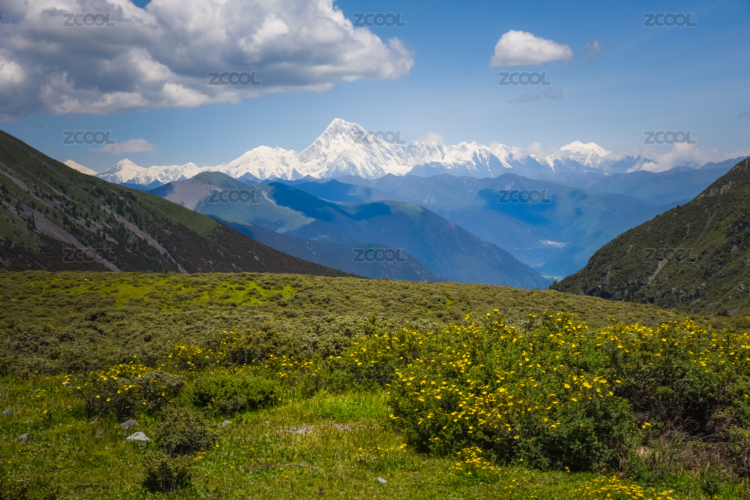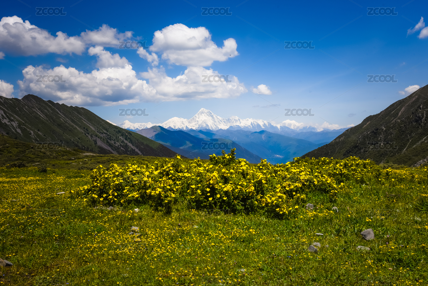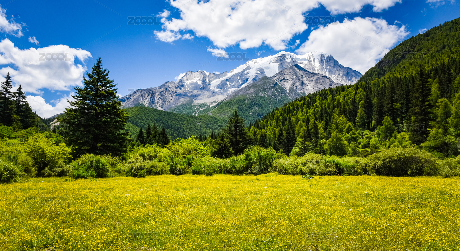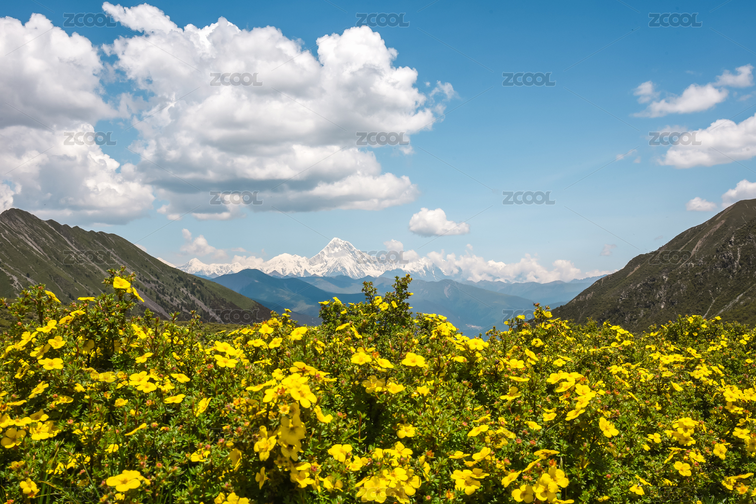 中國(guó)四川甘孜藏族自治州藍(lán)天白云下雪山花海
