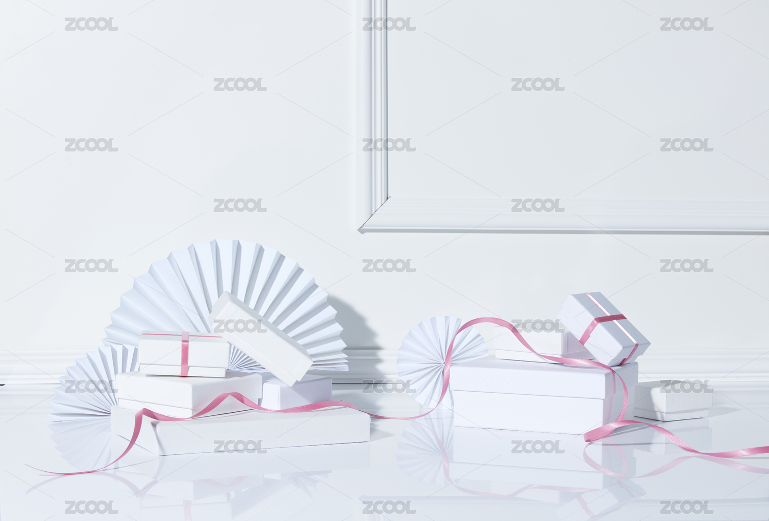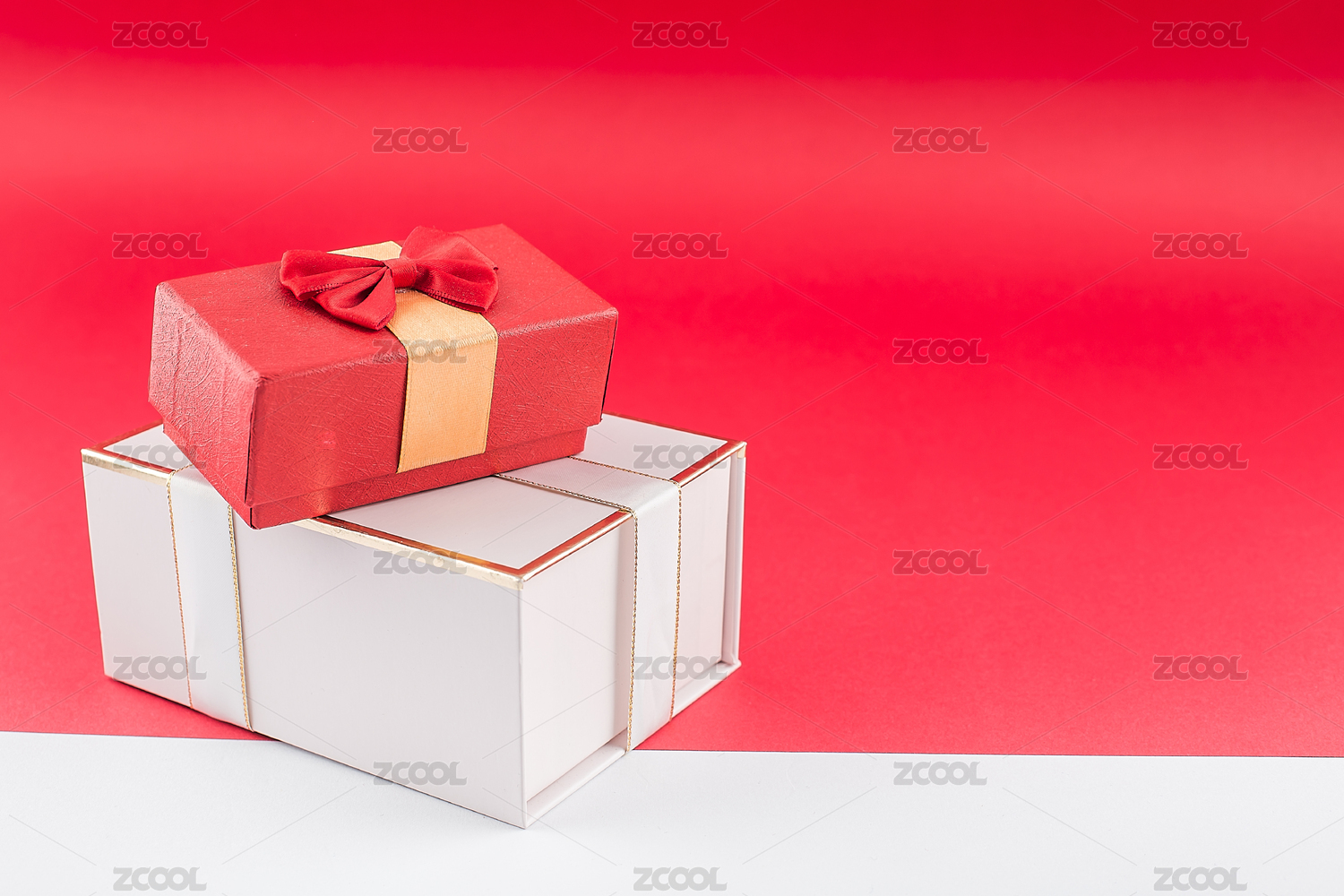 紅色和粉色的節(jié)日禮盒放在紅白相間的背景紙上。