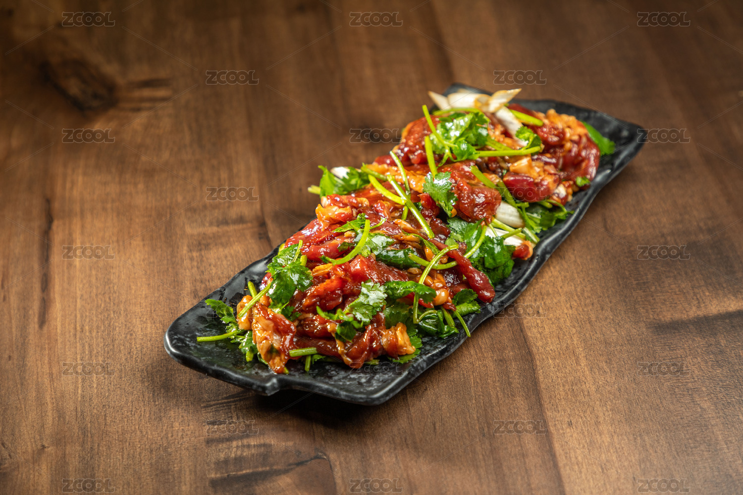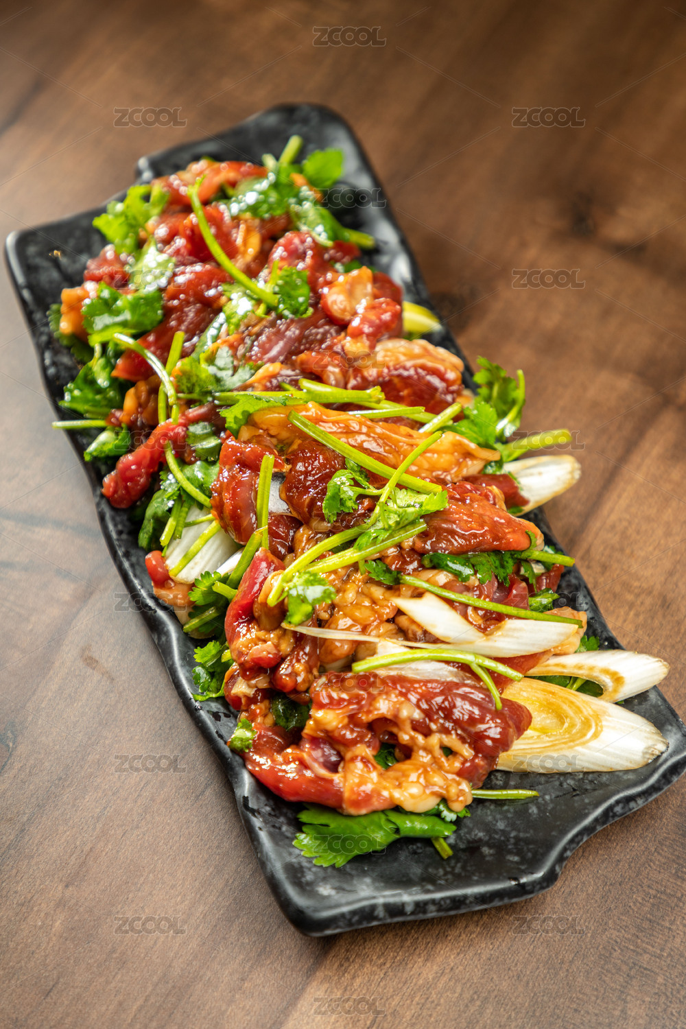 棕色木紋桌上放著一盤秘制手切鮮羊肉