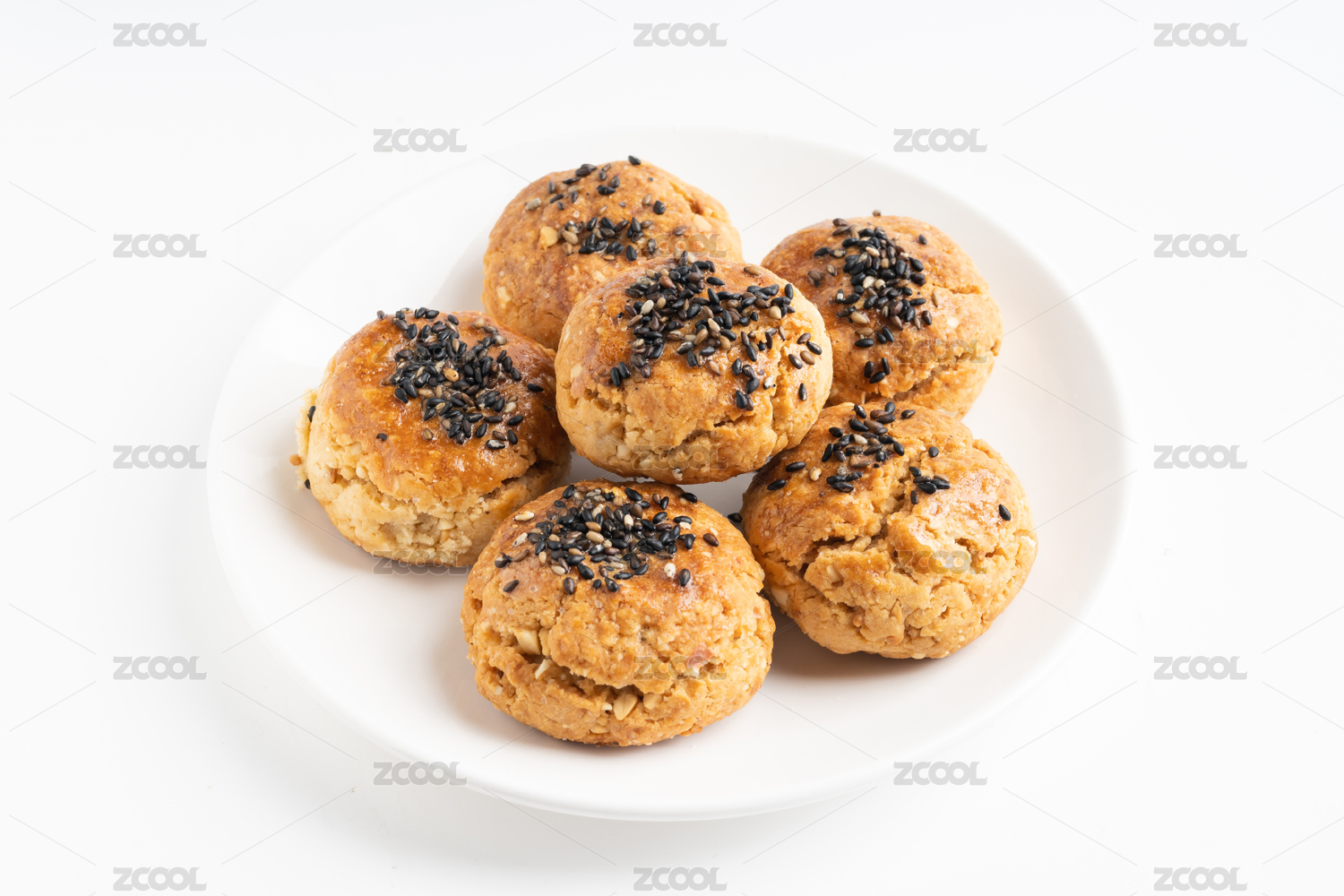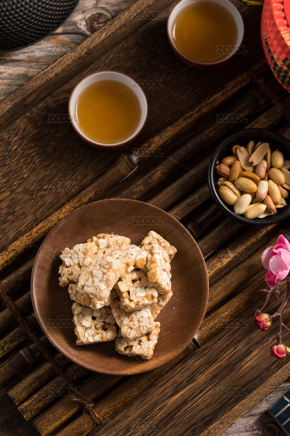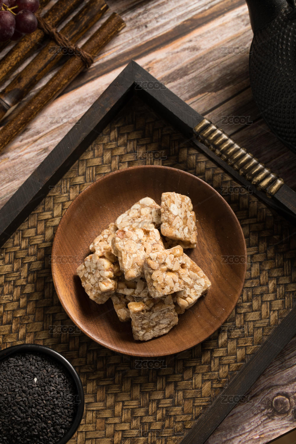 放在木盤中的傳統(tǒng)中式特色點心花生酥俯拍