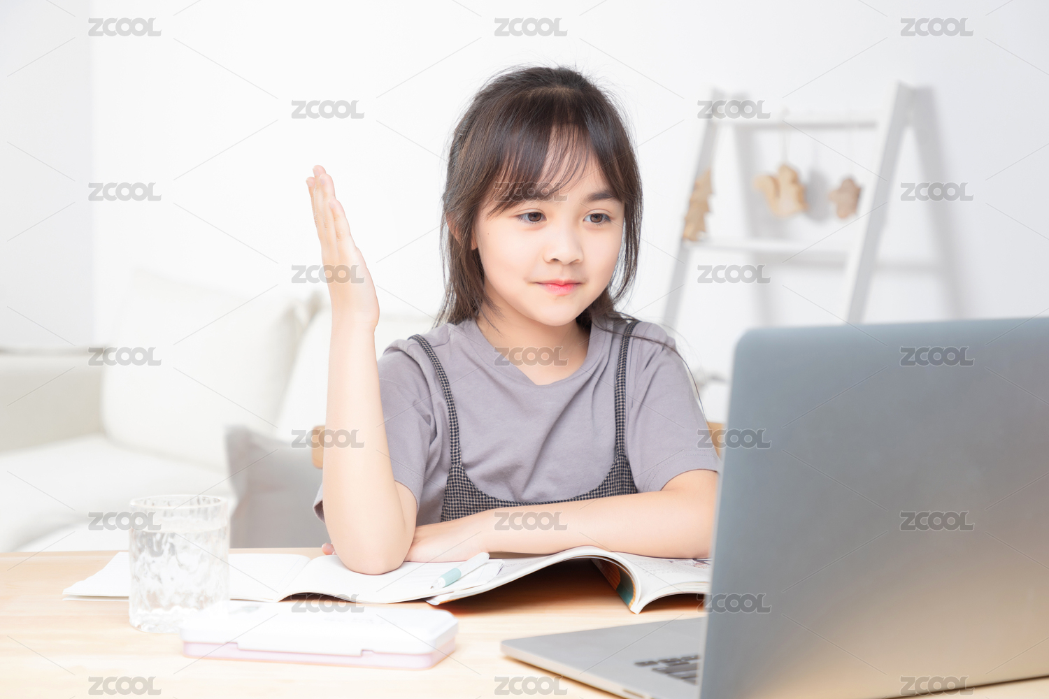 在家里上網(wǎng)課的小學(xué)女生