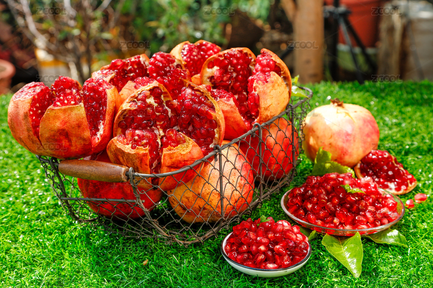 綠色草坪上放著一藍(lán)剝開的紅寶石石榴