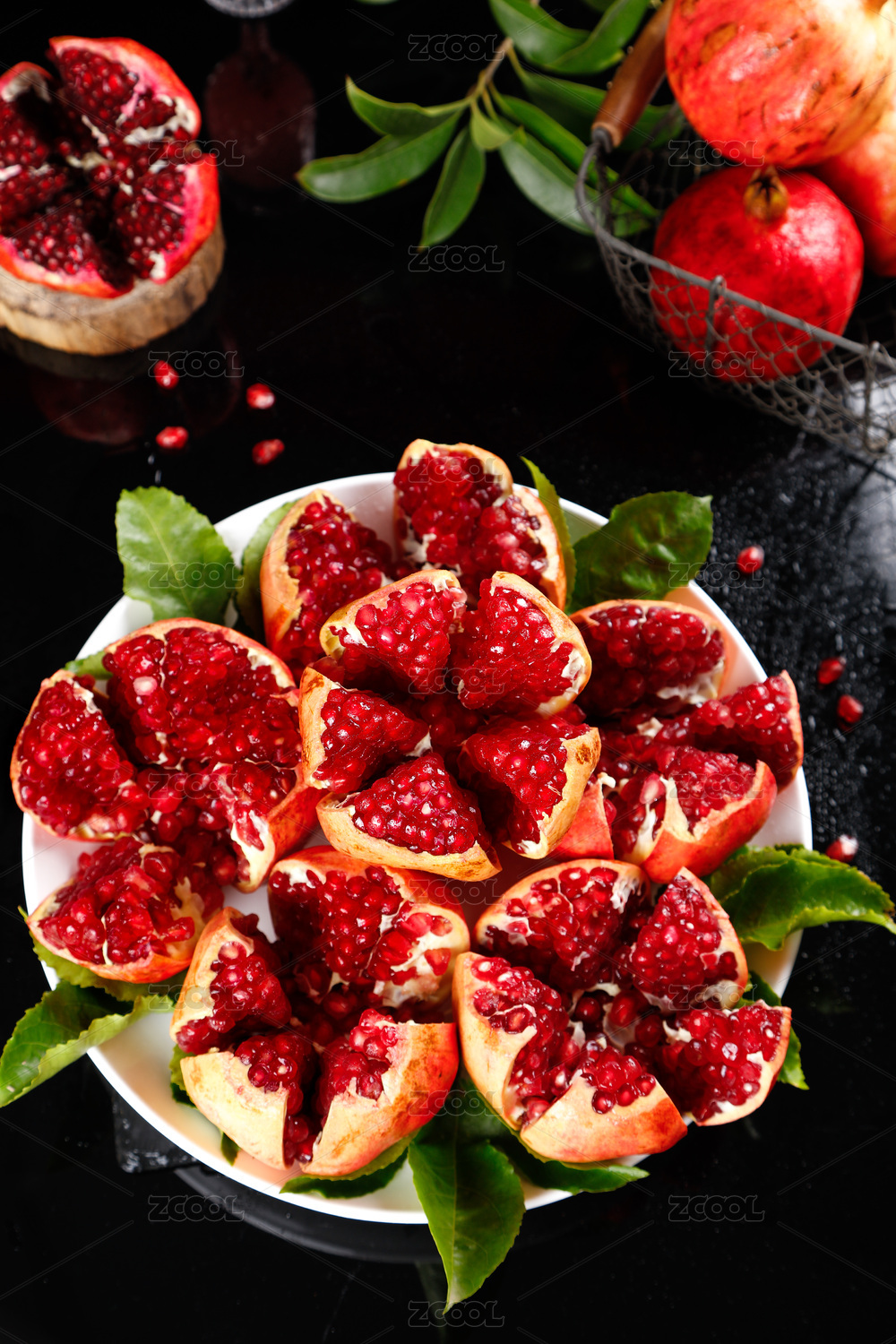 黑底上放著一盤掰開的紅寶石石榴