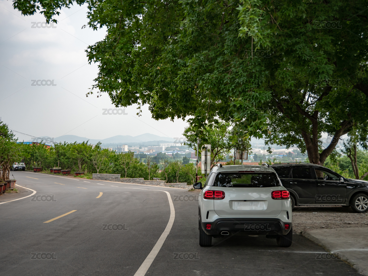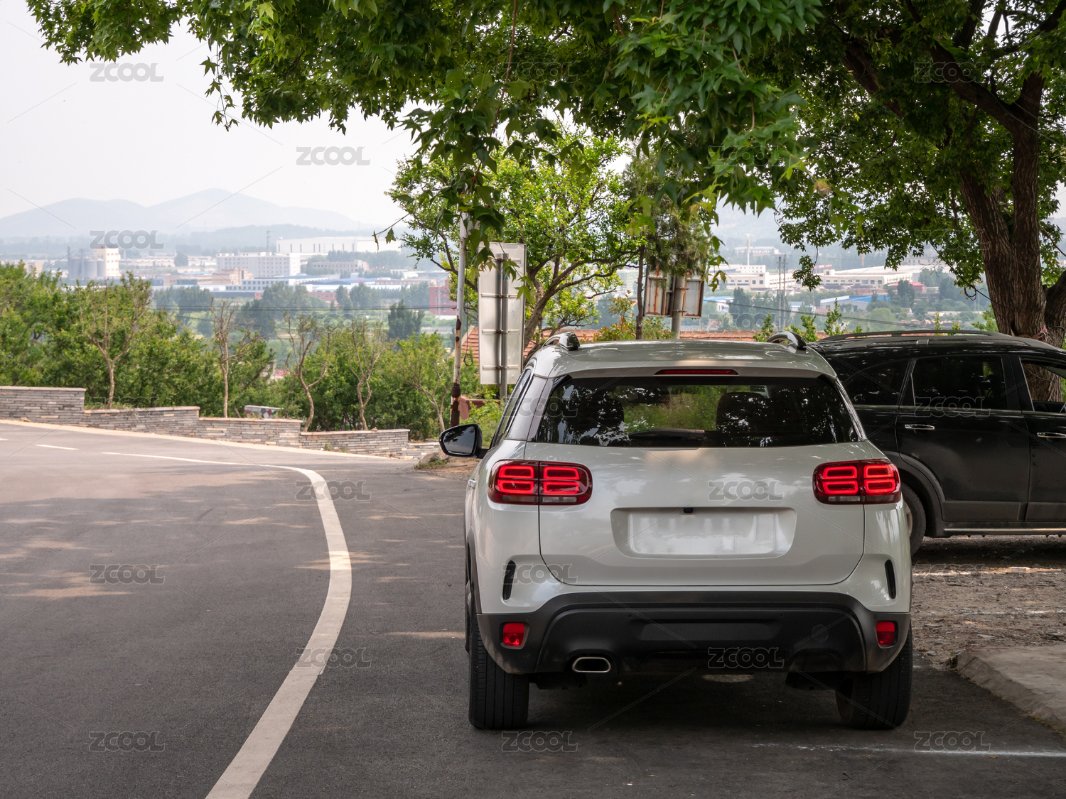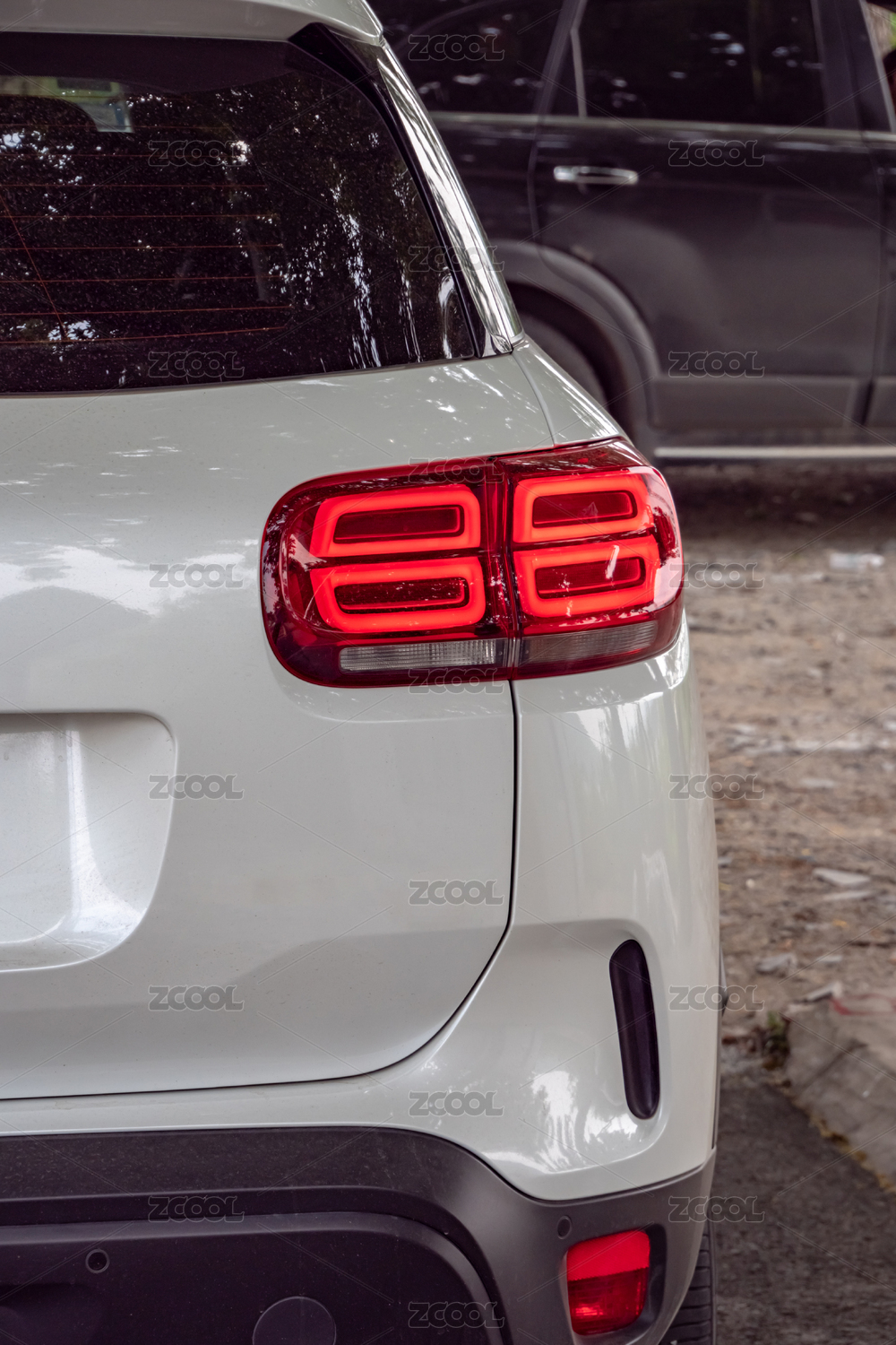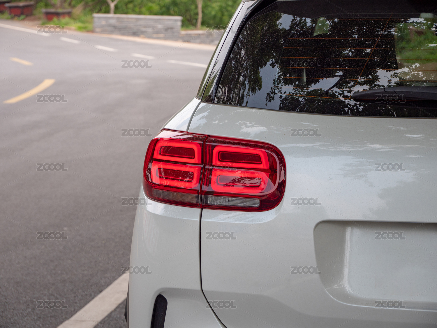 停在路邊樹下的汽車尾燈特寫