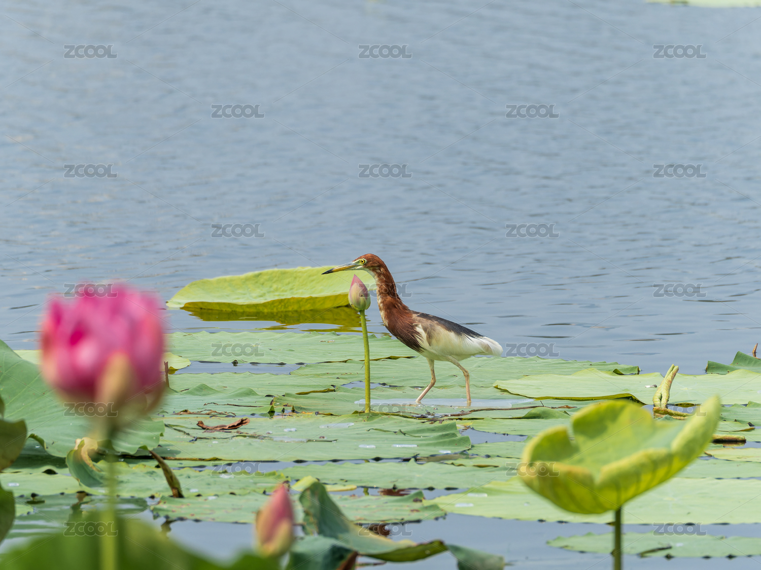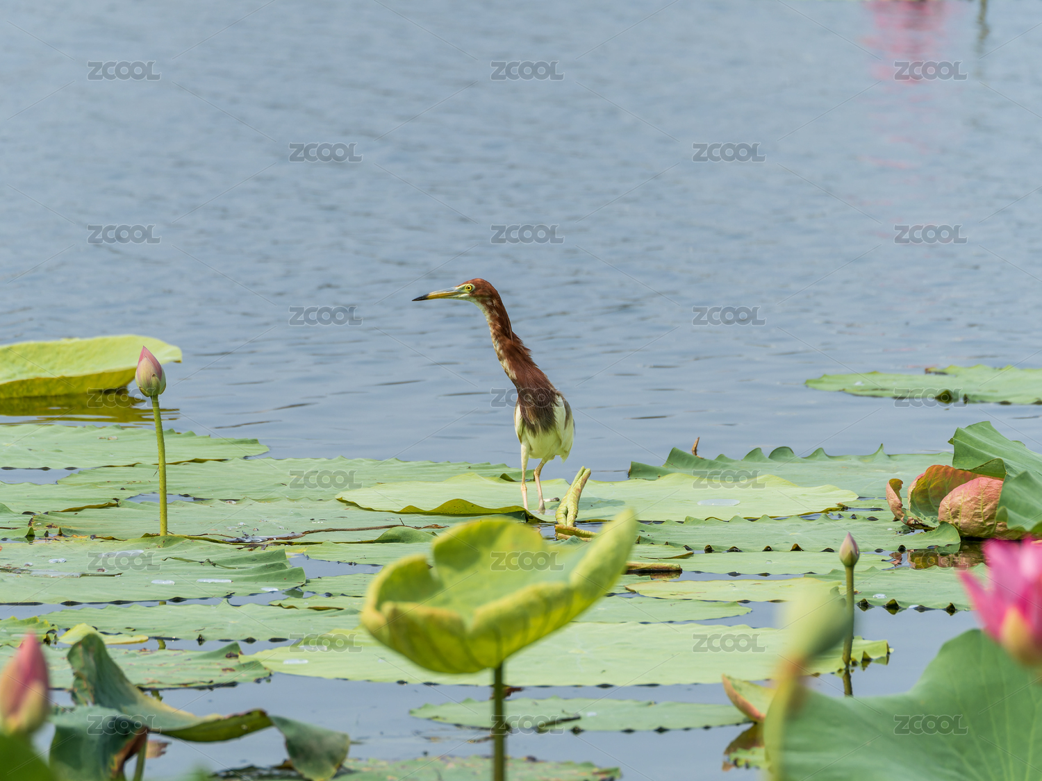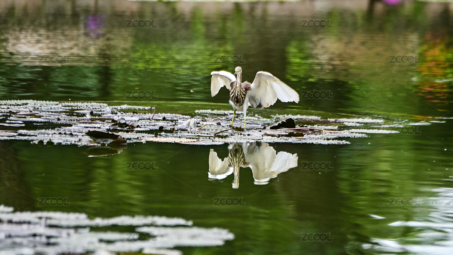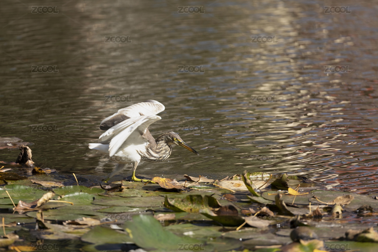 荷塘中棲息在荷葉下的池鷺