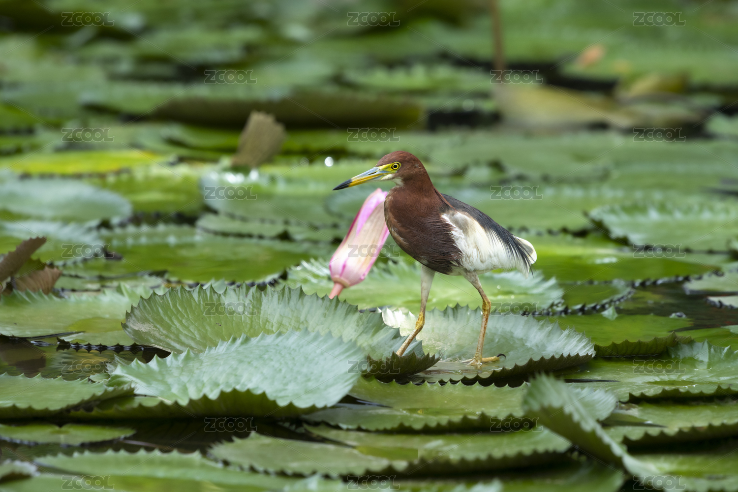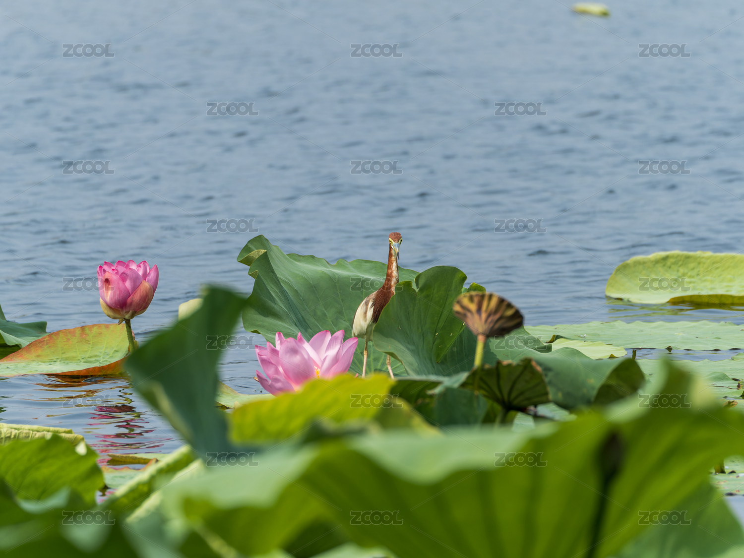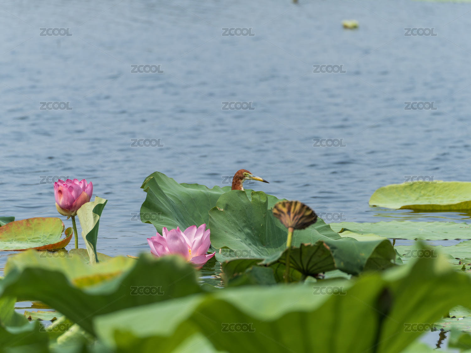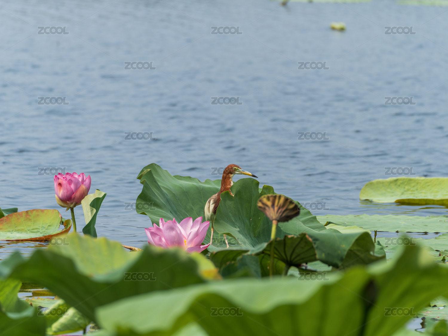 荷塘中棲息在荷葉下的池鷺