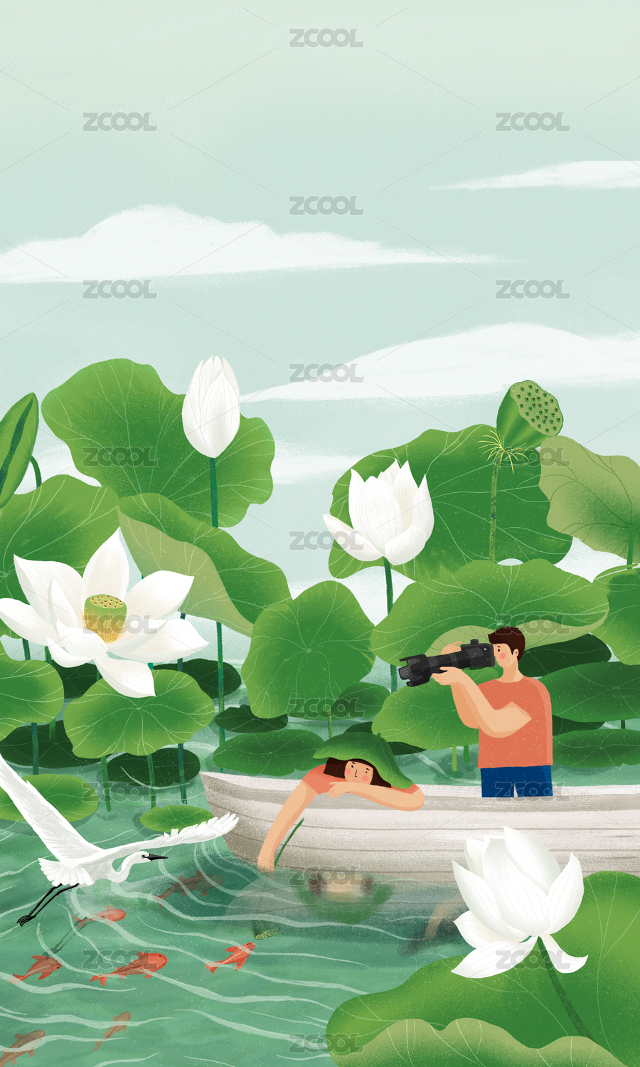 夏天荷塘里在船上賞荷游玩拍照的情侶