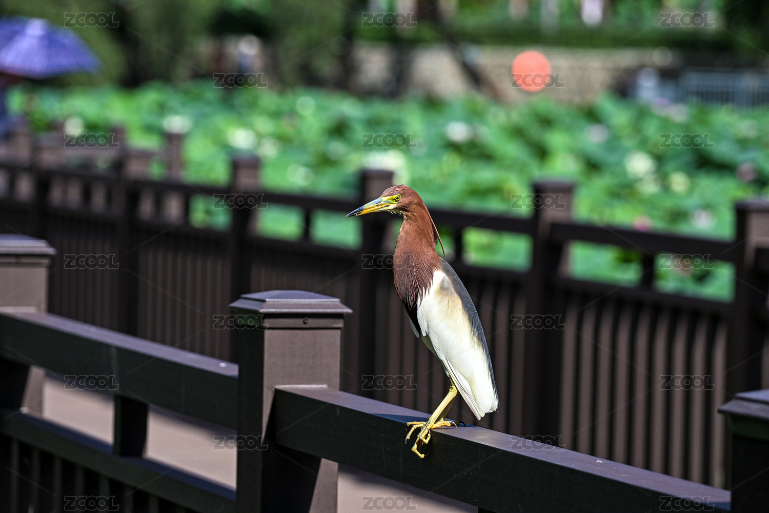 荷塘邊棲息在圍欄上的池鷺