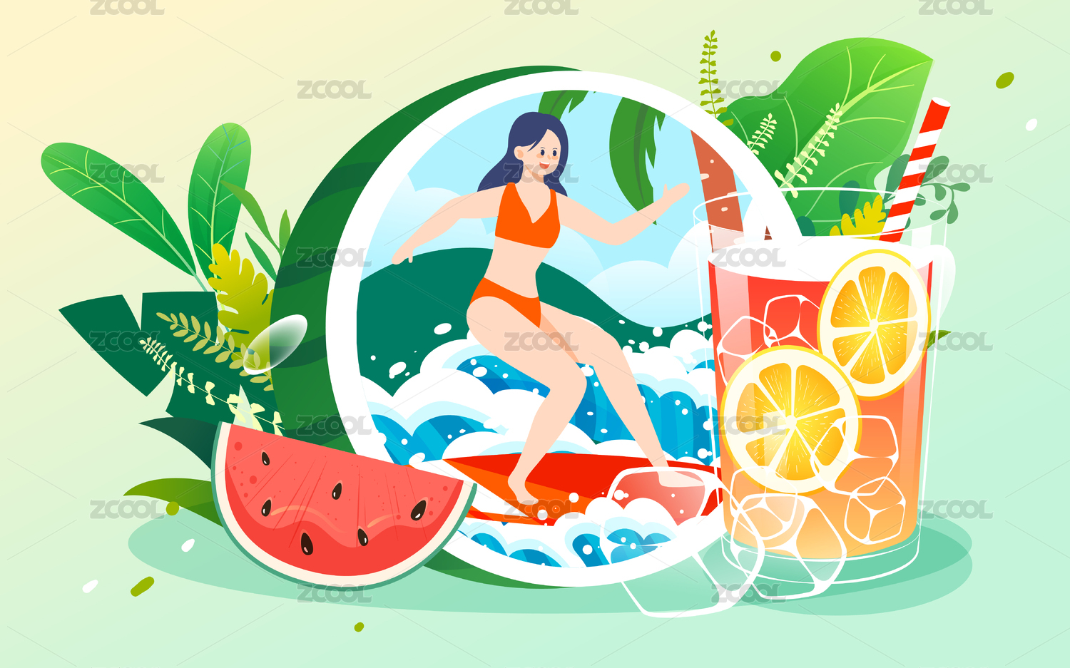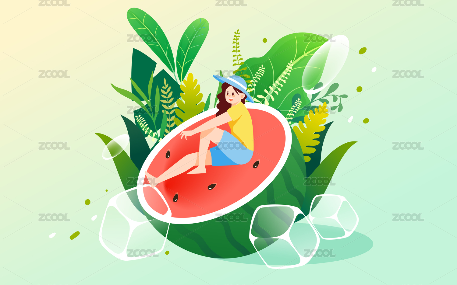 小暑節(jié)氣人物吃西瓜度假娛樂休閑水果插畫