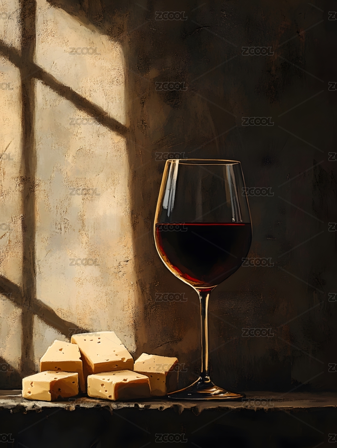 燈光下?lián)u曳的深紅美酒與奶酪