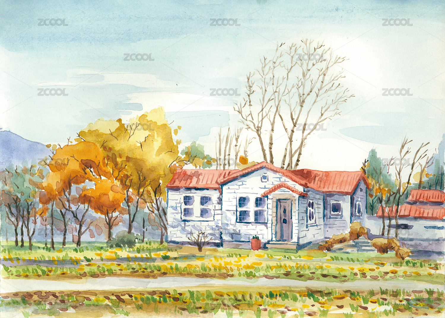 秋洋房獨(dú)樓歐式建筑房子田園風(fēng)景綠色黃色水彩手繪插畫