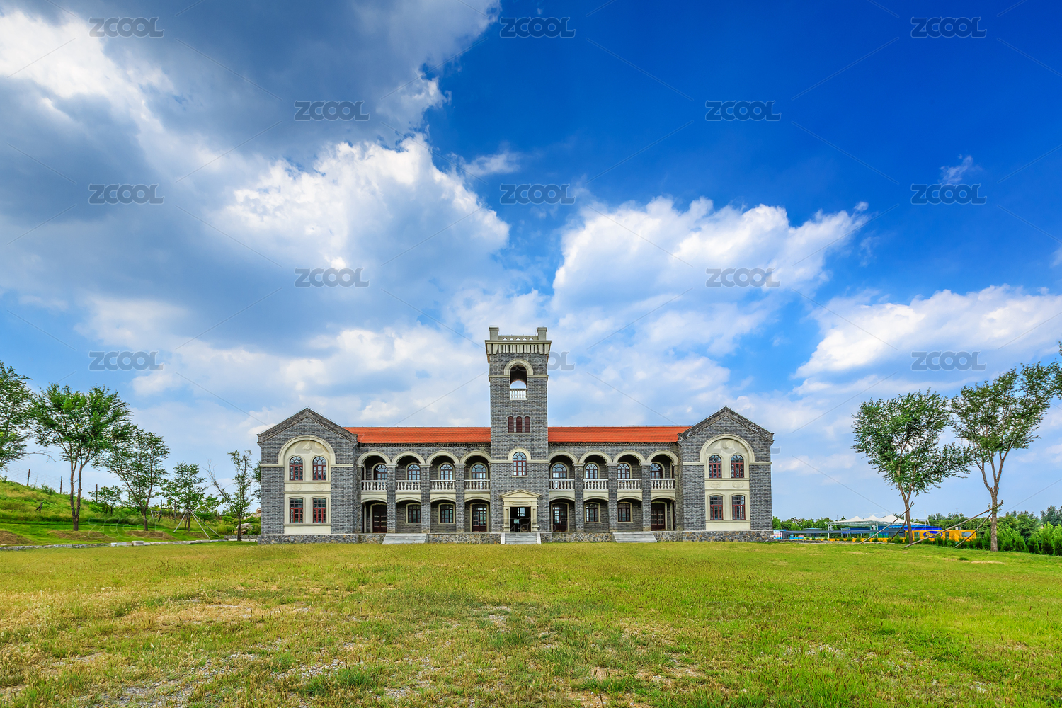 齊魯酒地風(fēng)景區(qū)的歐式建筑與藍(lán)天白云草場(chǎng)