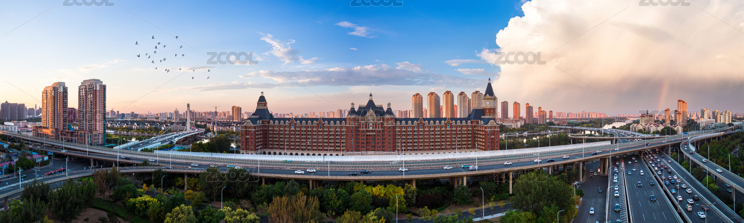天津海津大橋海河城市地標(biāo)建筑日落全景風(fēng)光