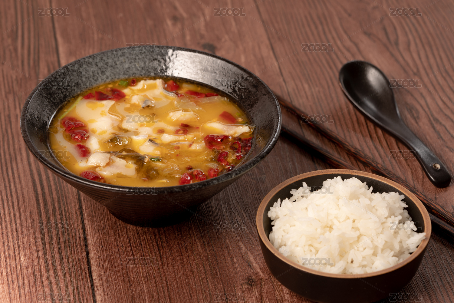紅褐色木板桌面上碗里的酸菜魚,和旁邊的一碗米飯