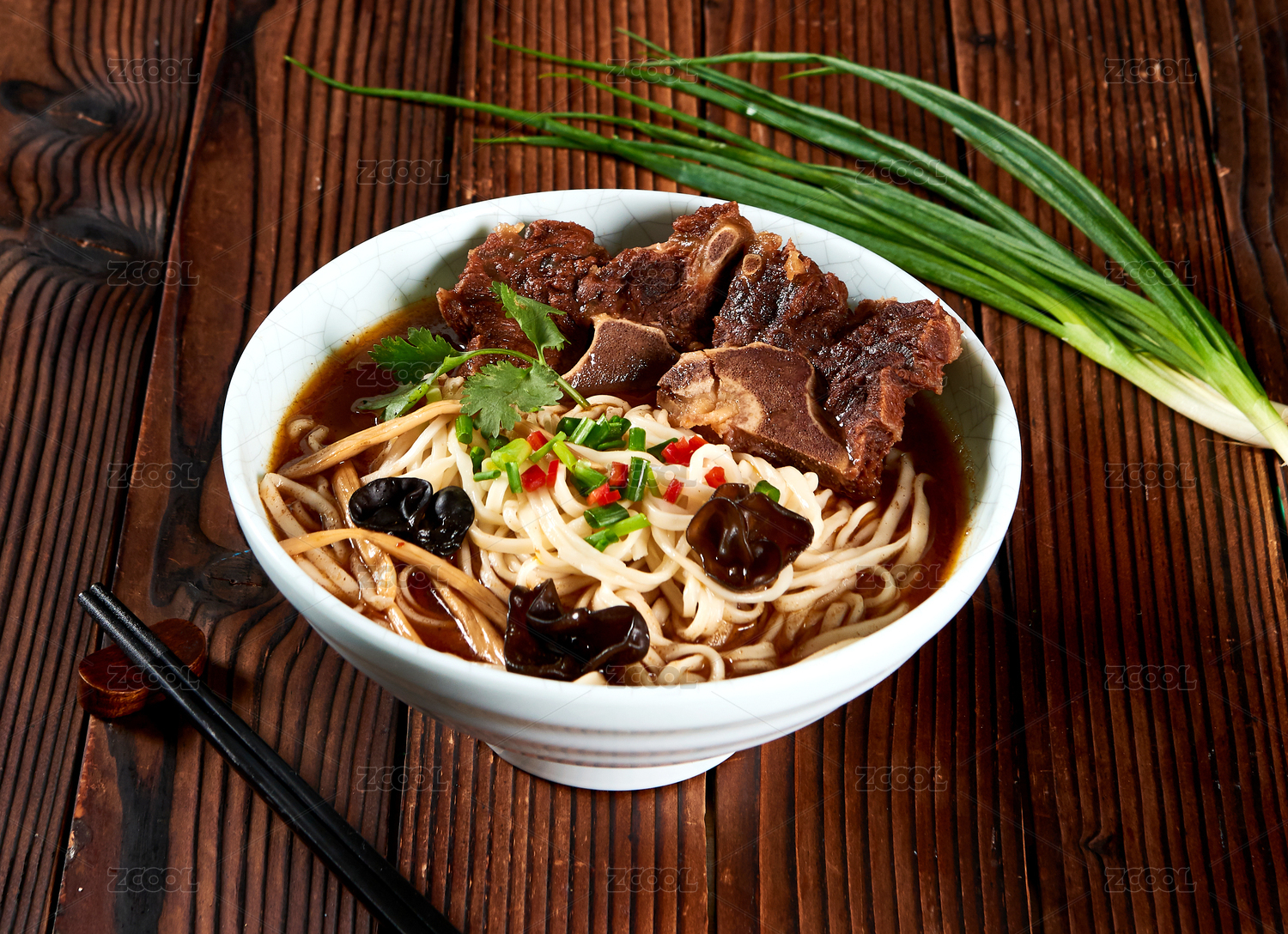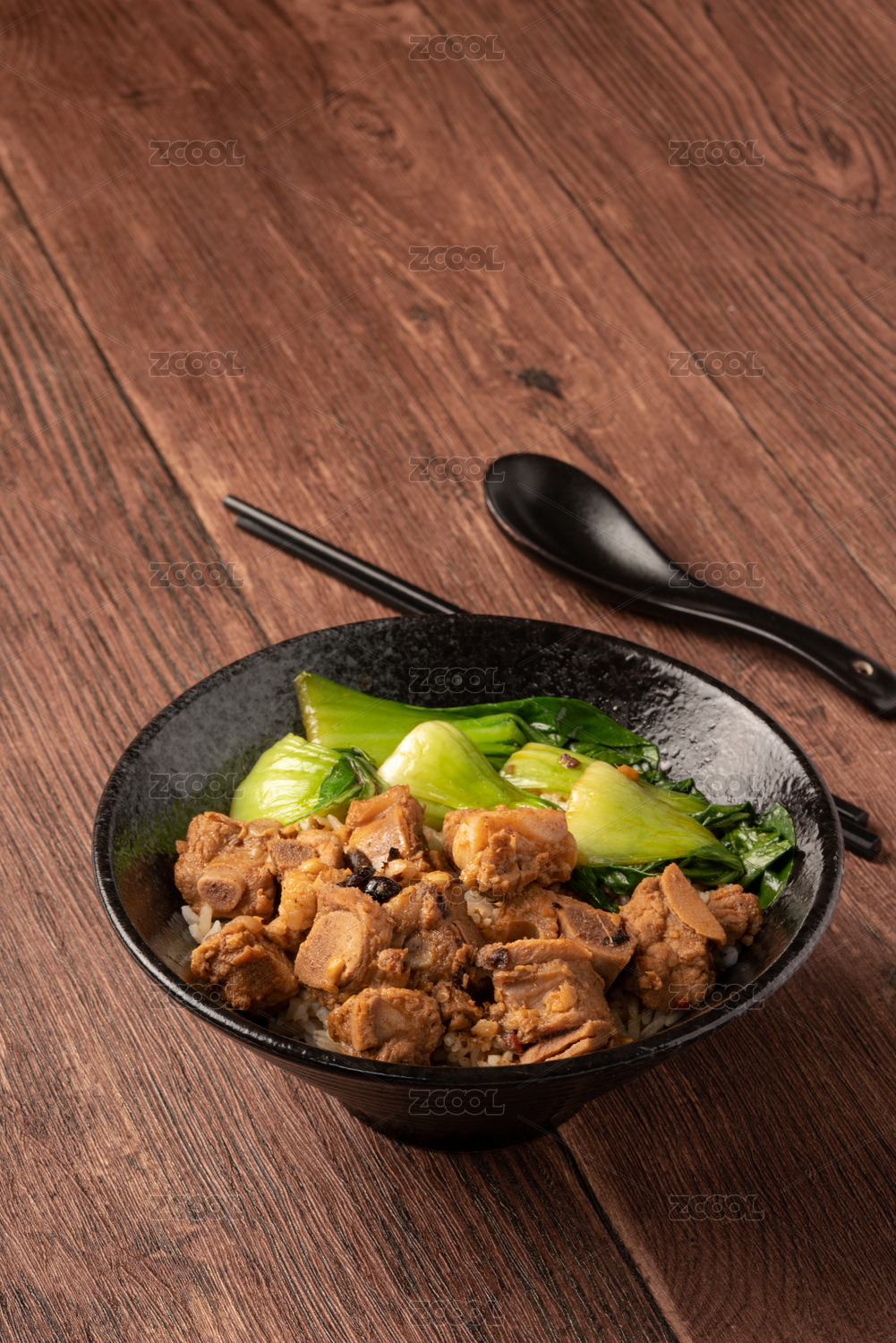 紅褐色桌面上的餐具和碗里的排骨飯?zhí)罪?/div>