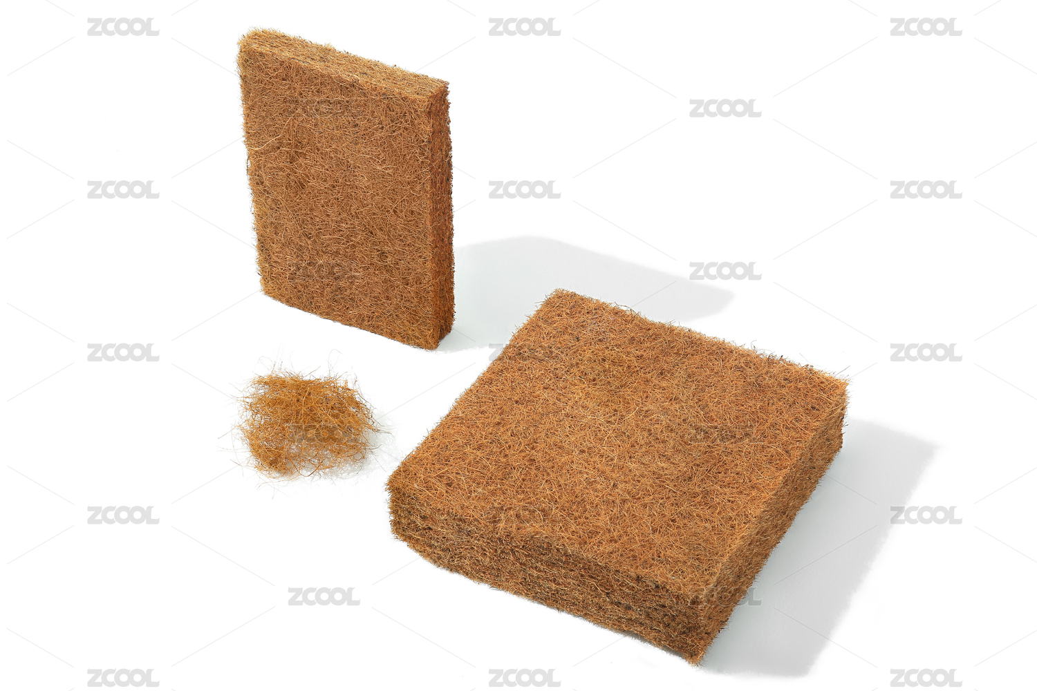 棕褐色椰棕絲和椰棕塊放在白色的背景上
