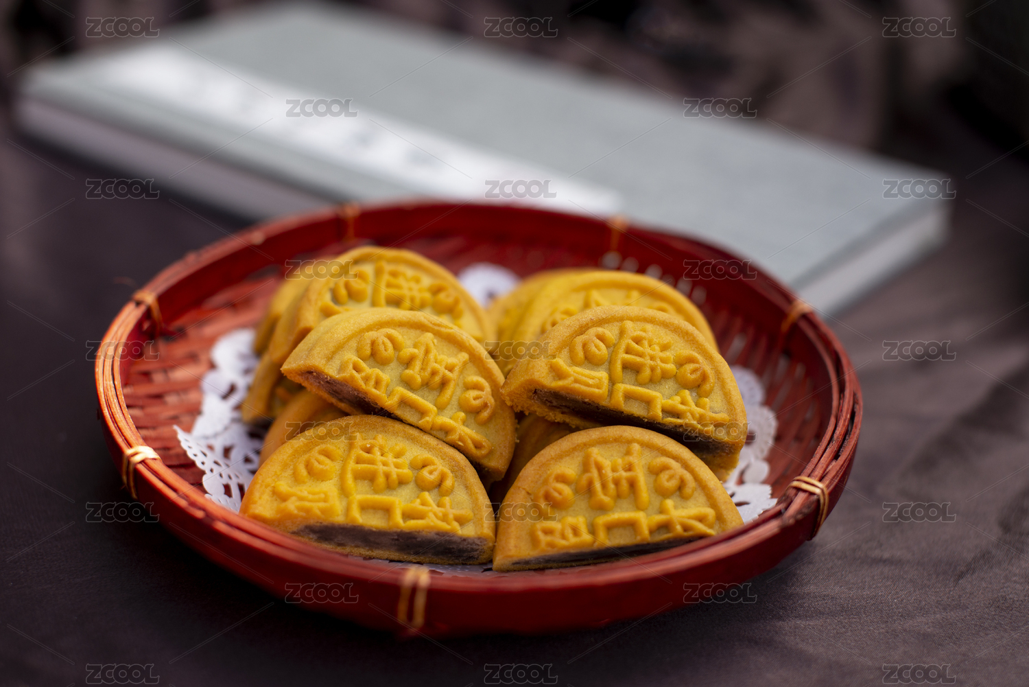 棕褐色的臺(tái)布上擺放有序的糕點(diǎn)容器與線裝書