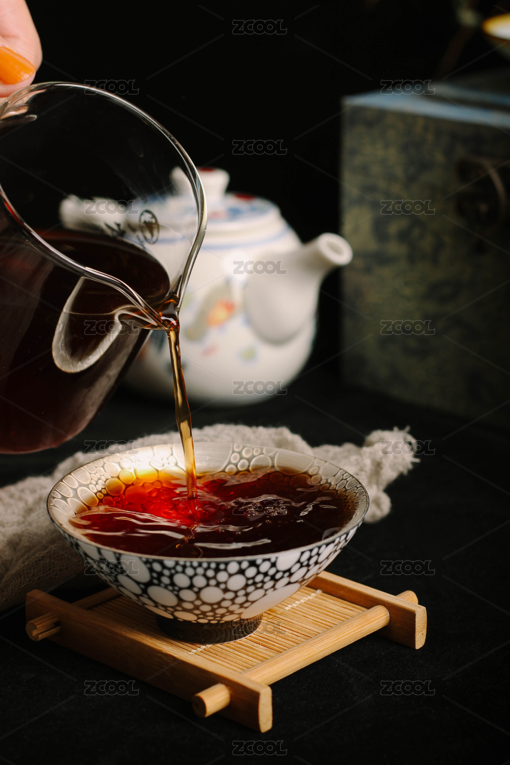 黑色背景上的褐色普洱茶湯倒在銀制的杯子中