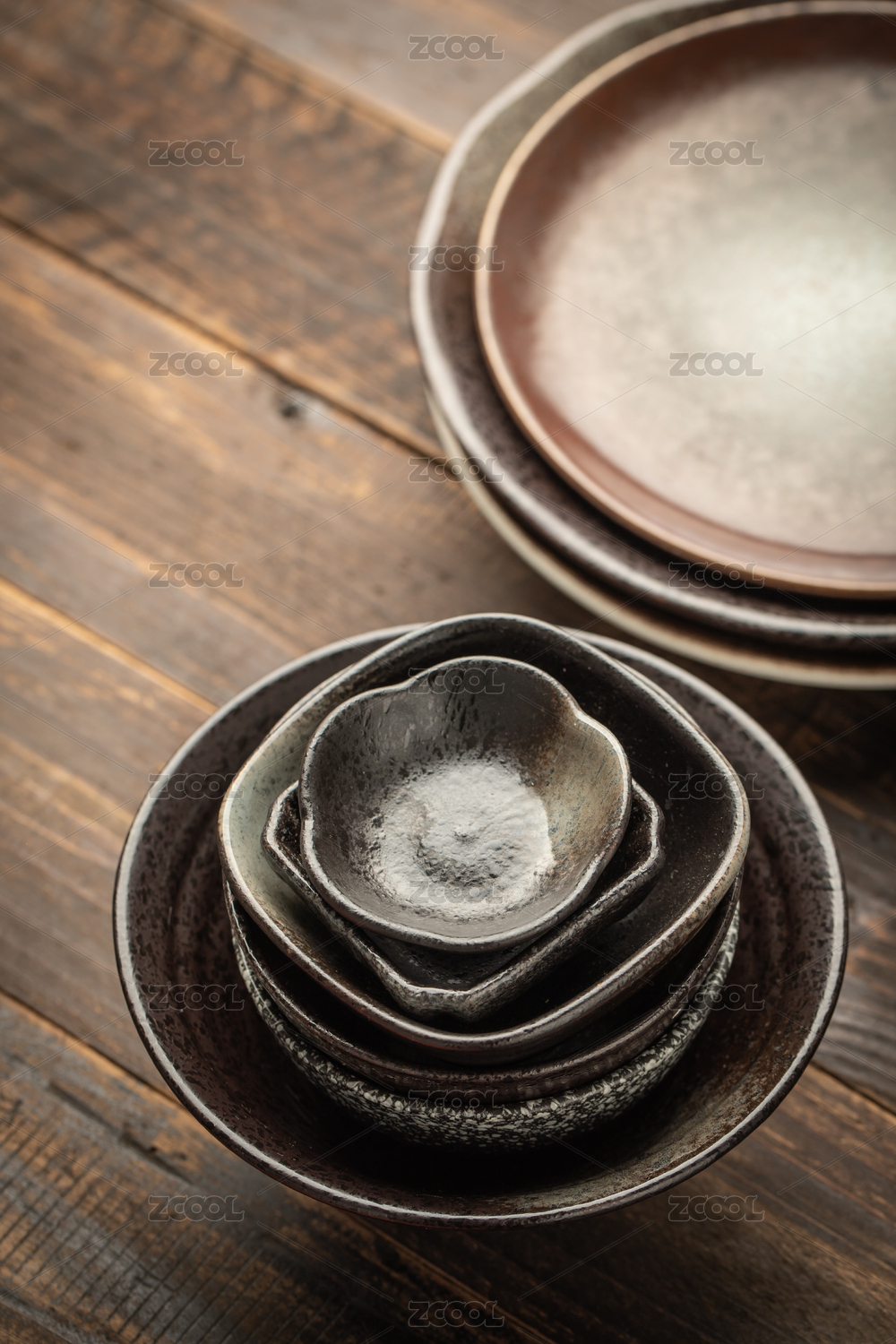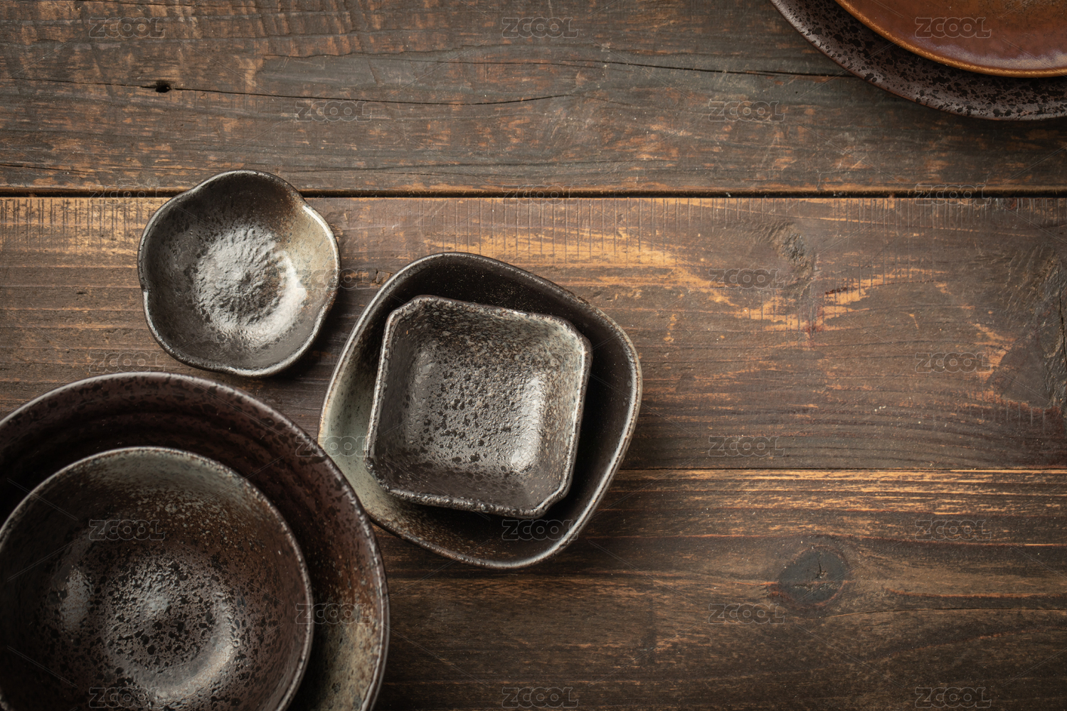 木制背景上的亞洲傳統(tǒng)復古陶瓷餐具