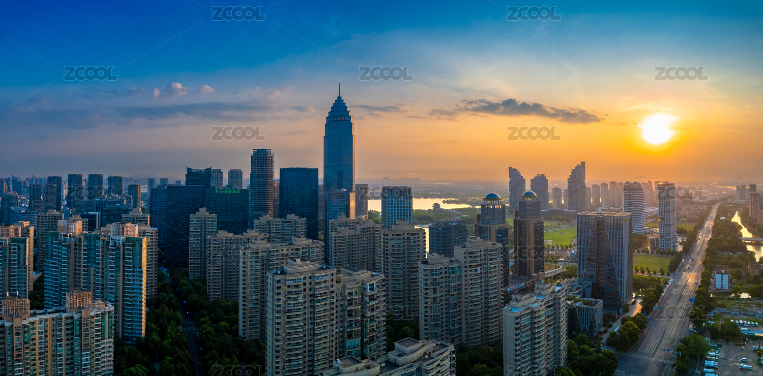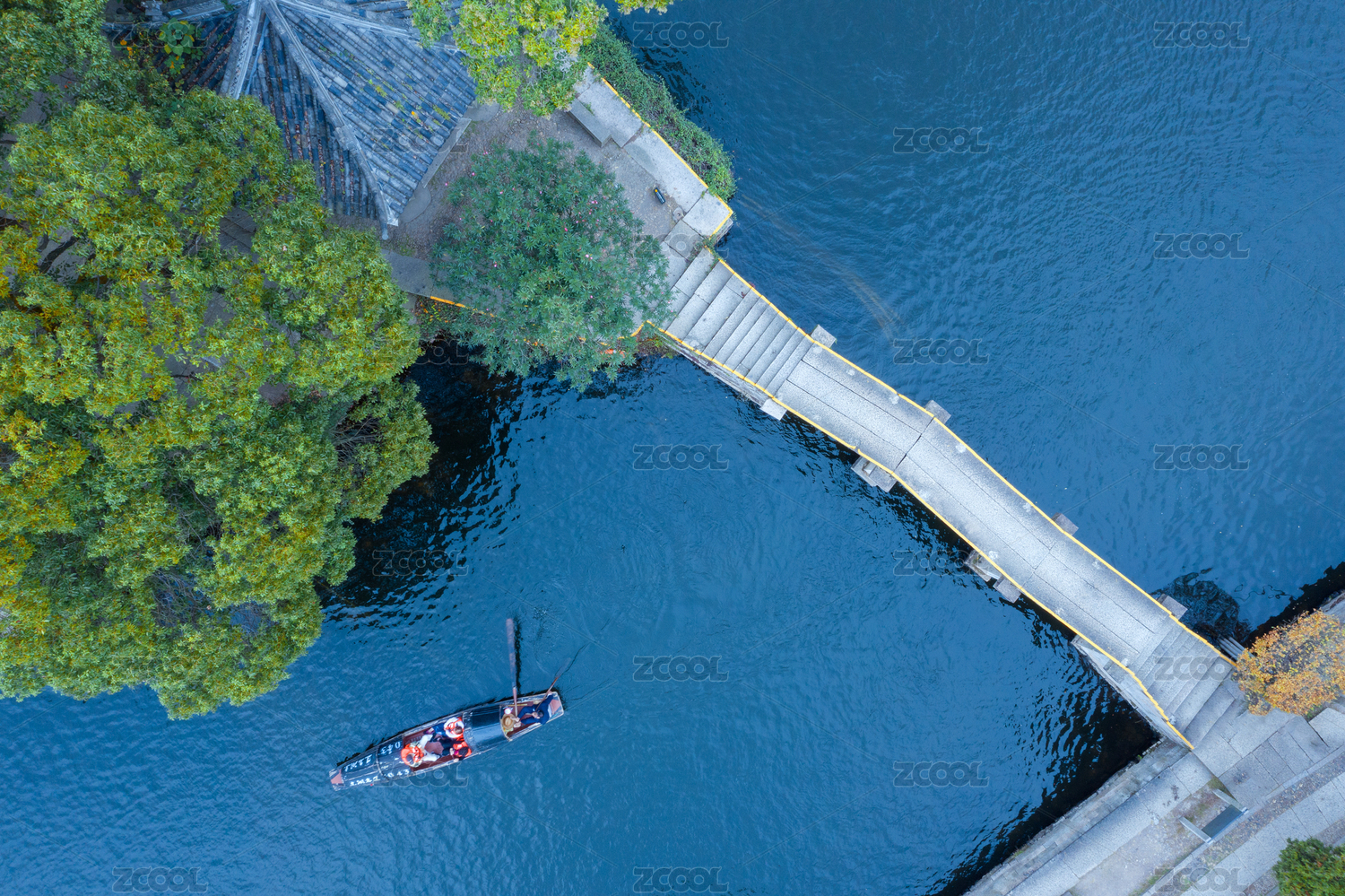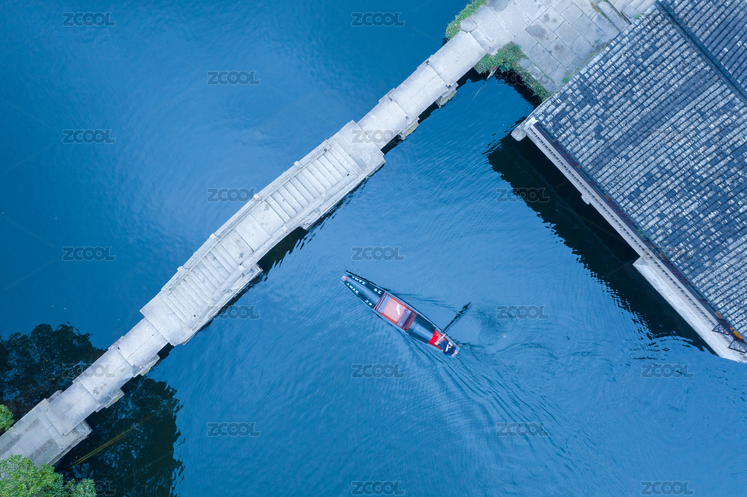浙江省紹興市俯視有石橋和小船的藍(lán)色湖泊