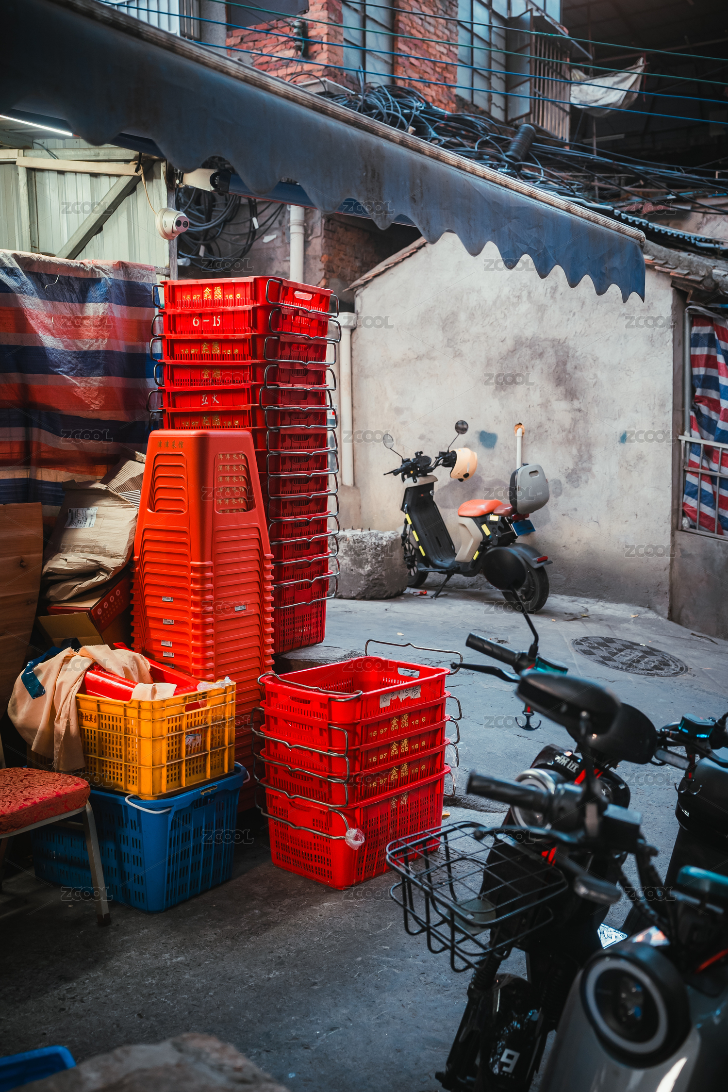 舊街道堆疊的紅色塑料凳和框