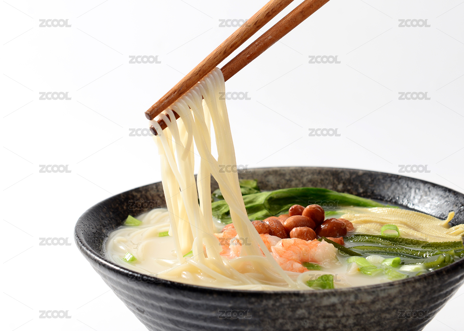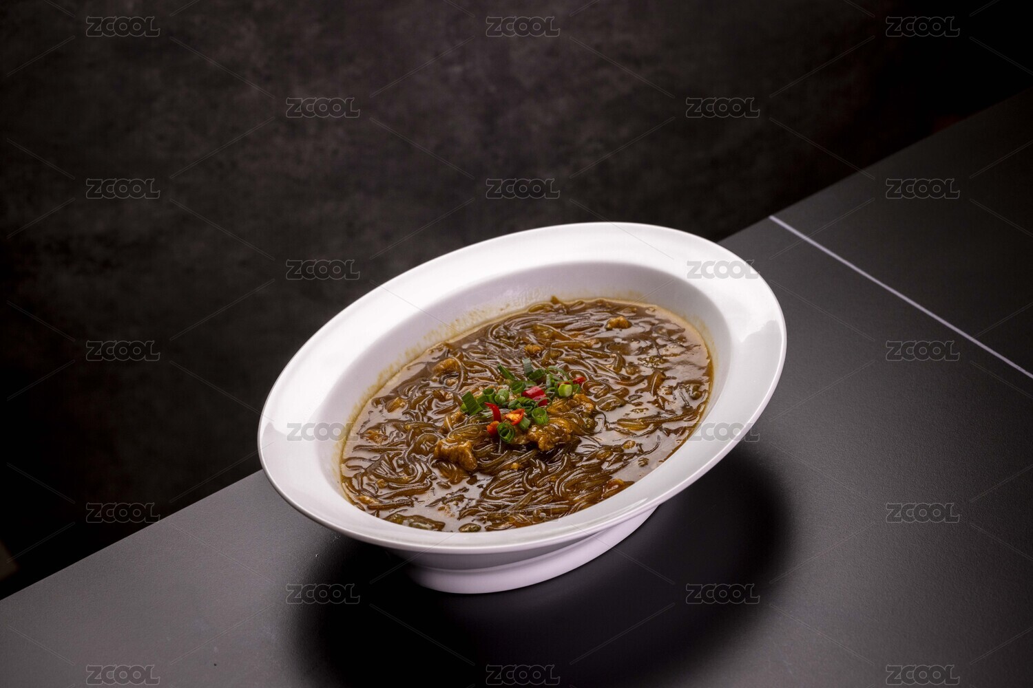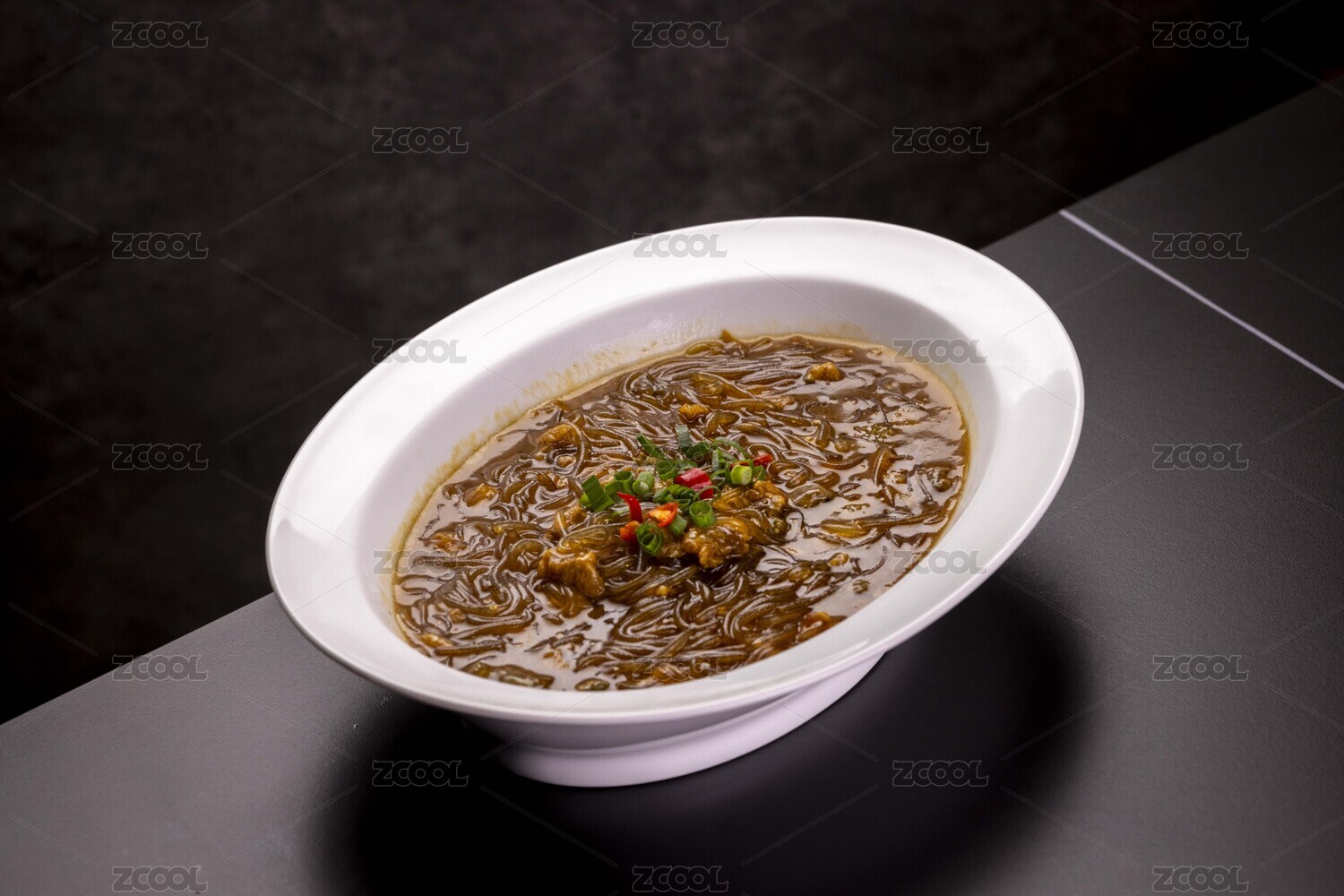 大理石背景上碗里的海鮮米線