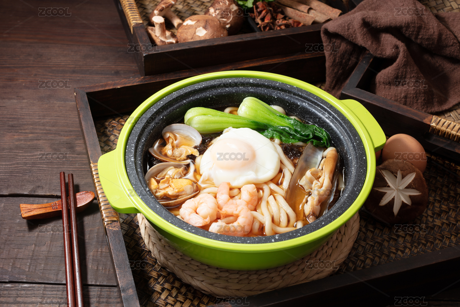 木盒上草墊上石鍋里的海鮮米線