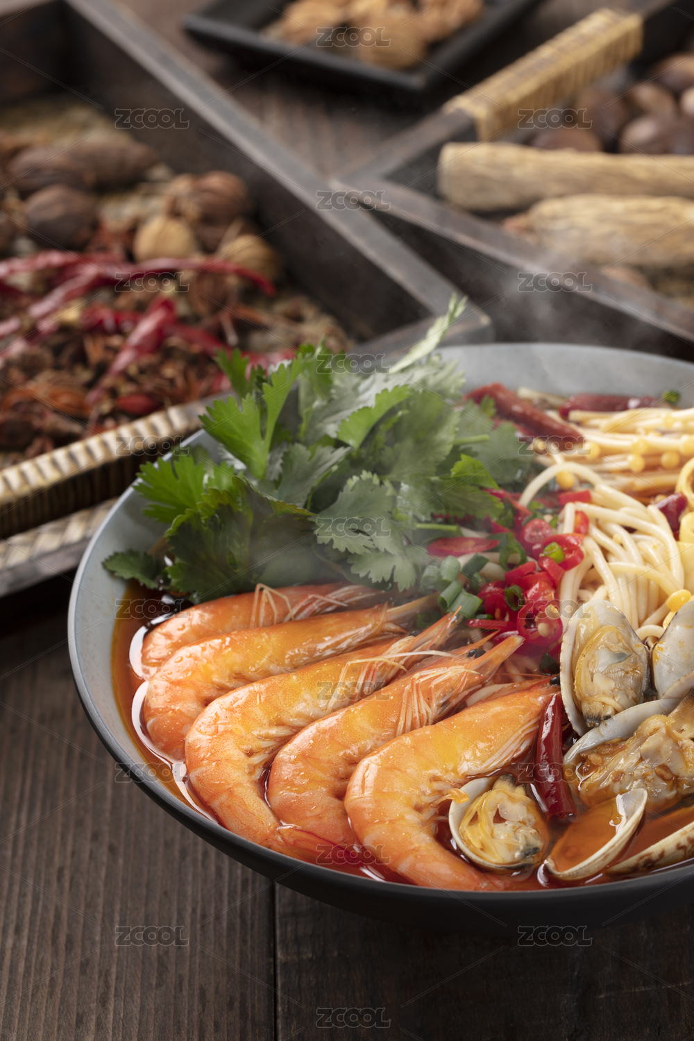 黑色碗里的花甲大蝦麻辣海鮮米線