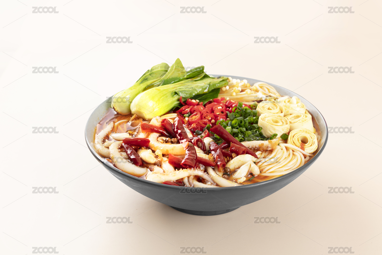 黑色碗里的麻辣魷魚海鮮米線