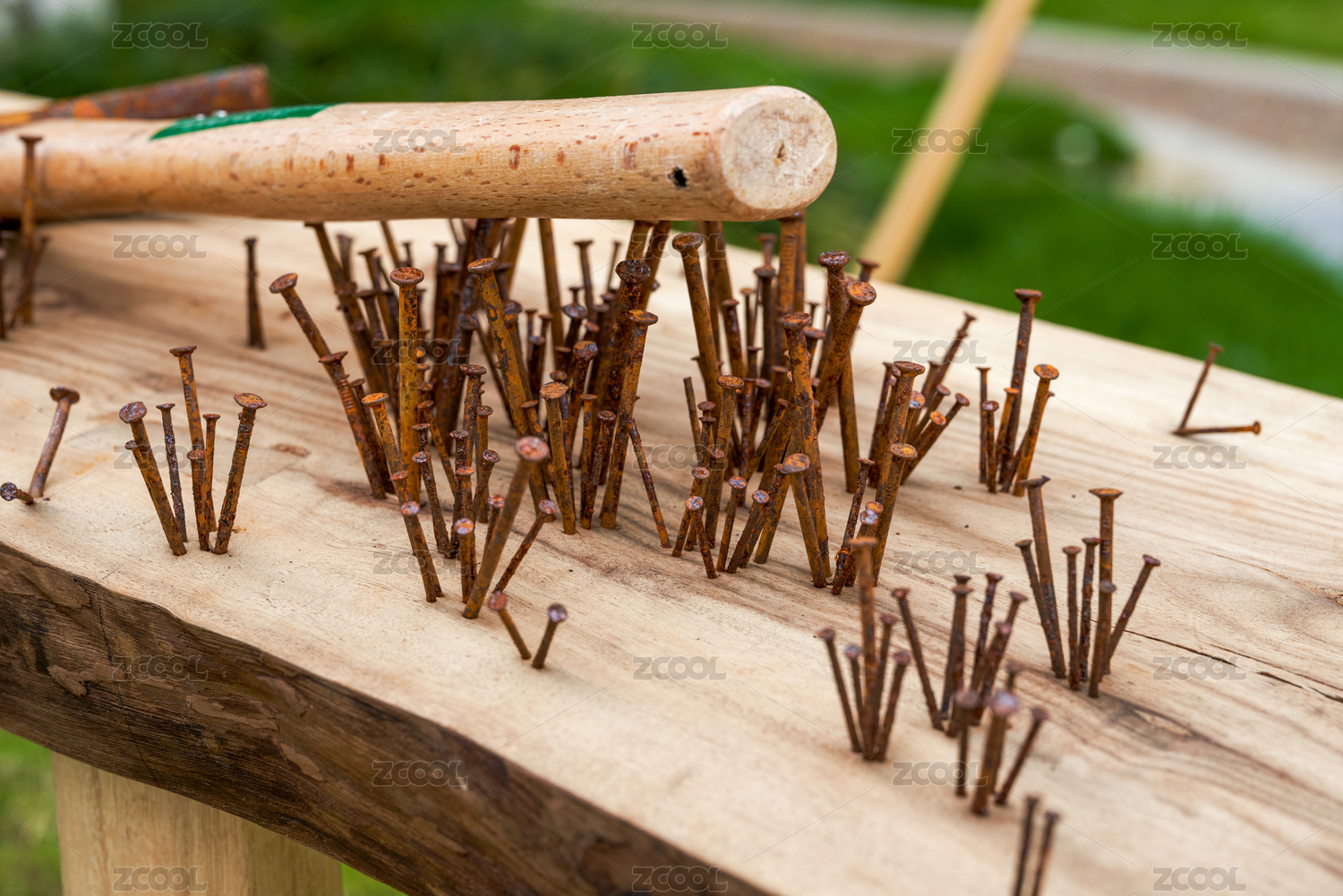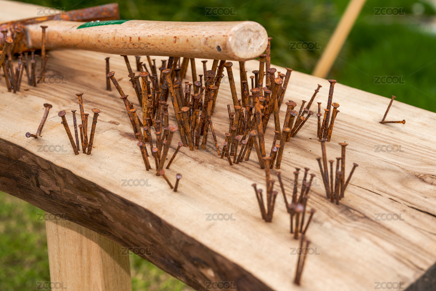 木板上一堆凌亂的生銹釘子和錘子
